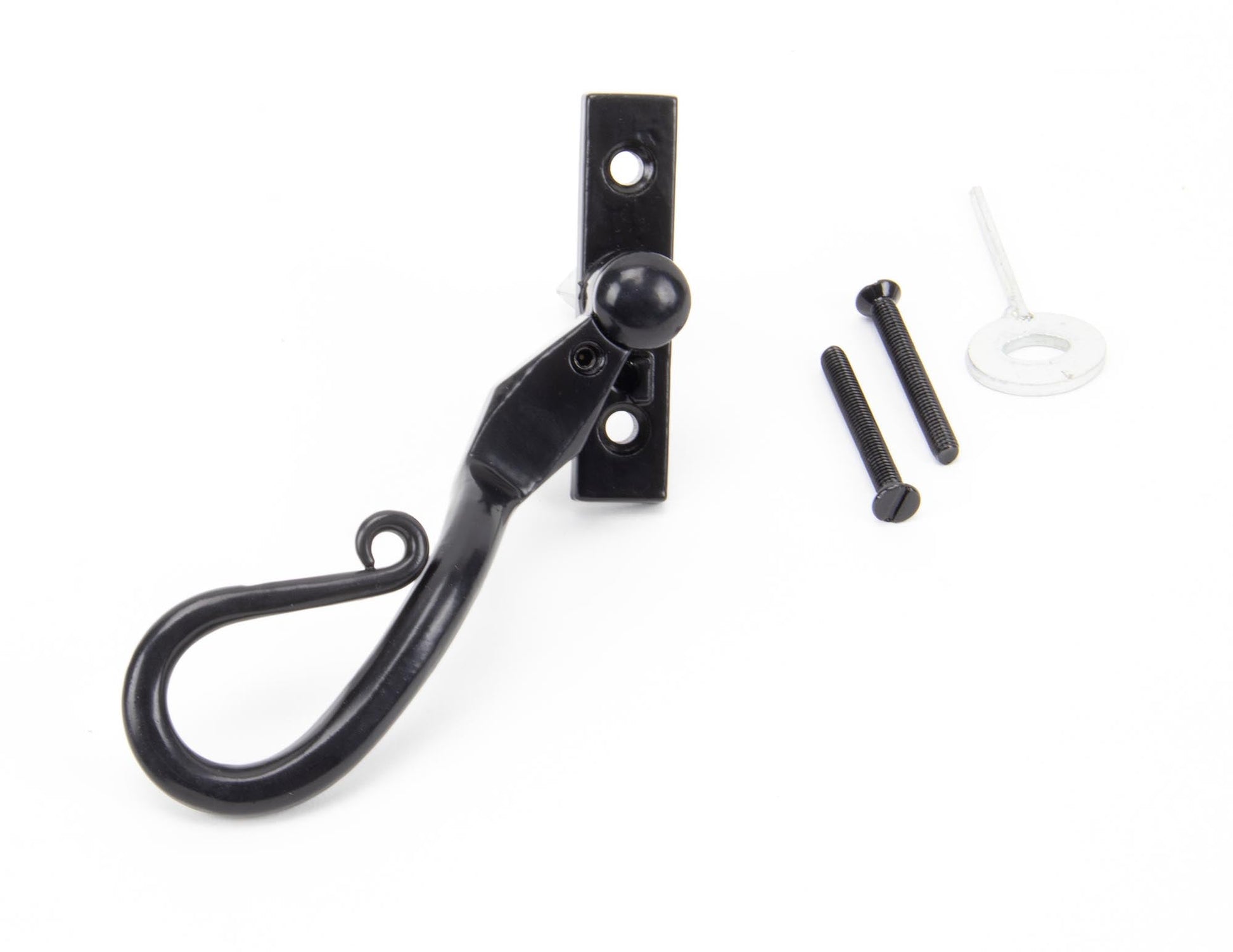 The image showcases a beautifully hand-forged window fastener, its surface enhanced by subtle curves and elegant details. The handle forms a graceful crook, reminiscent of the classic shepherd’s crook design, lending a touch of period character and timeless charm to any setting. This piece exudes both heritage appeal and a dignified contemporary look, perfect for those seeking a sophisticated addition to their windows.