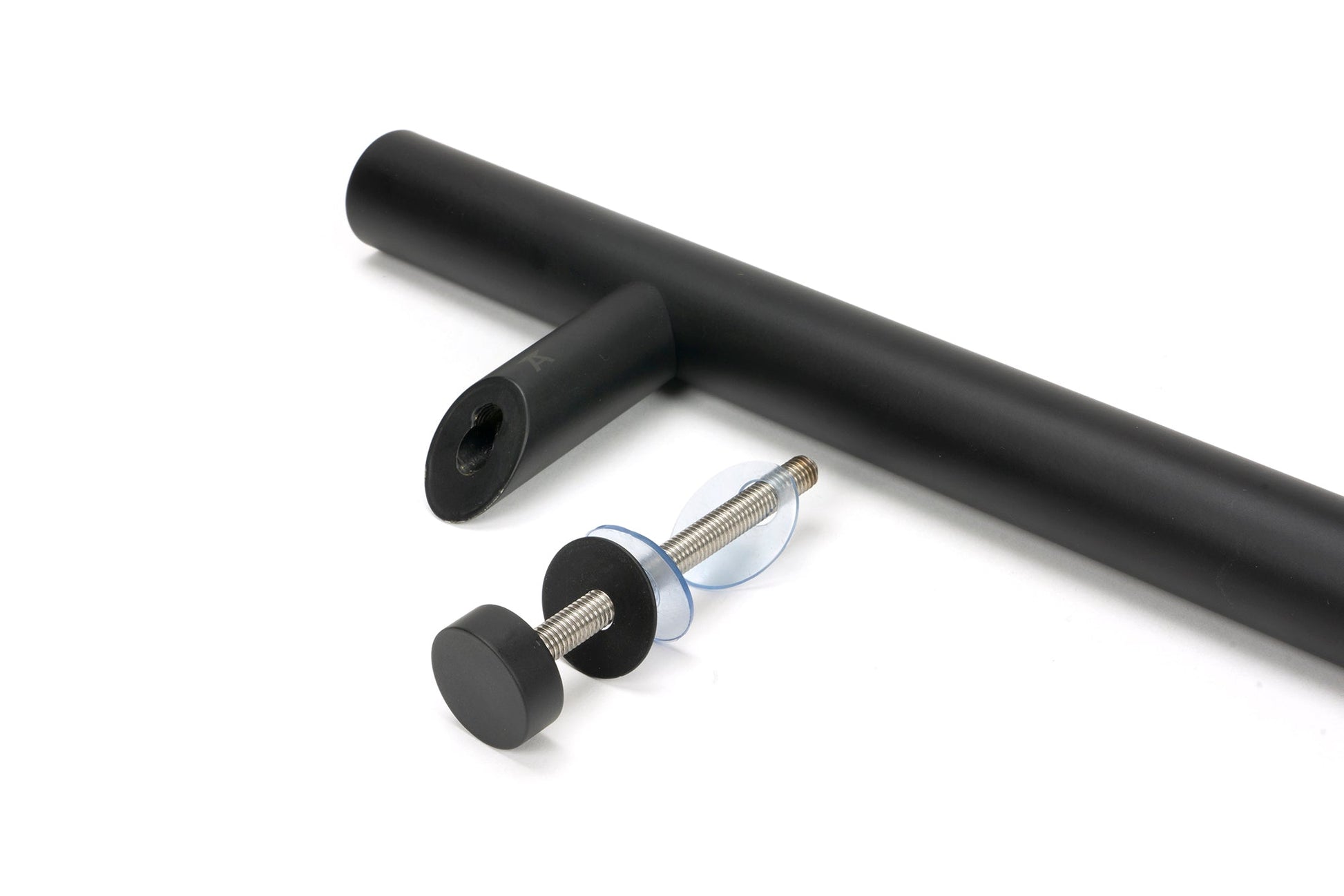 The image showcases a sleek, contemporary fixing kit, featuring clean lines and a refined, understated silhouette. Designed to accentuate the modern t bar pull handles, the fixings offer a subtle yet stylish appearance, perfectly suited to modern entranceways and interior design schemes. The matt black finish provides a striking visual contrast that complements both minimalist and traditional décors.