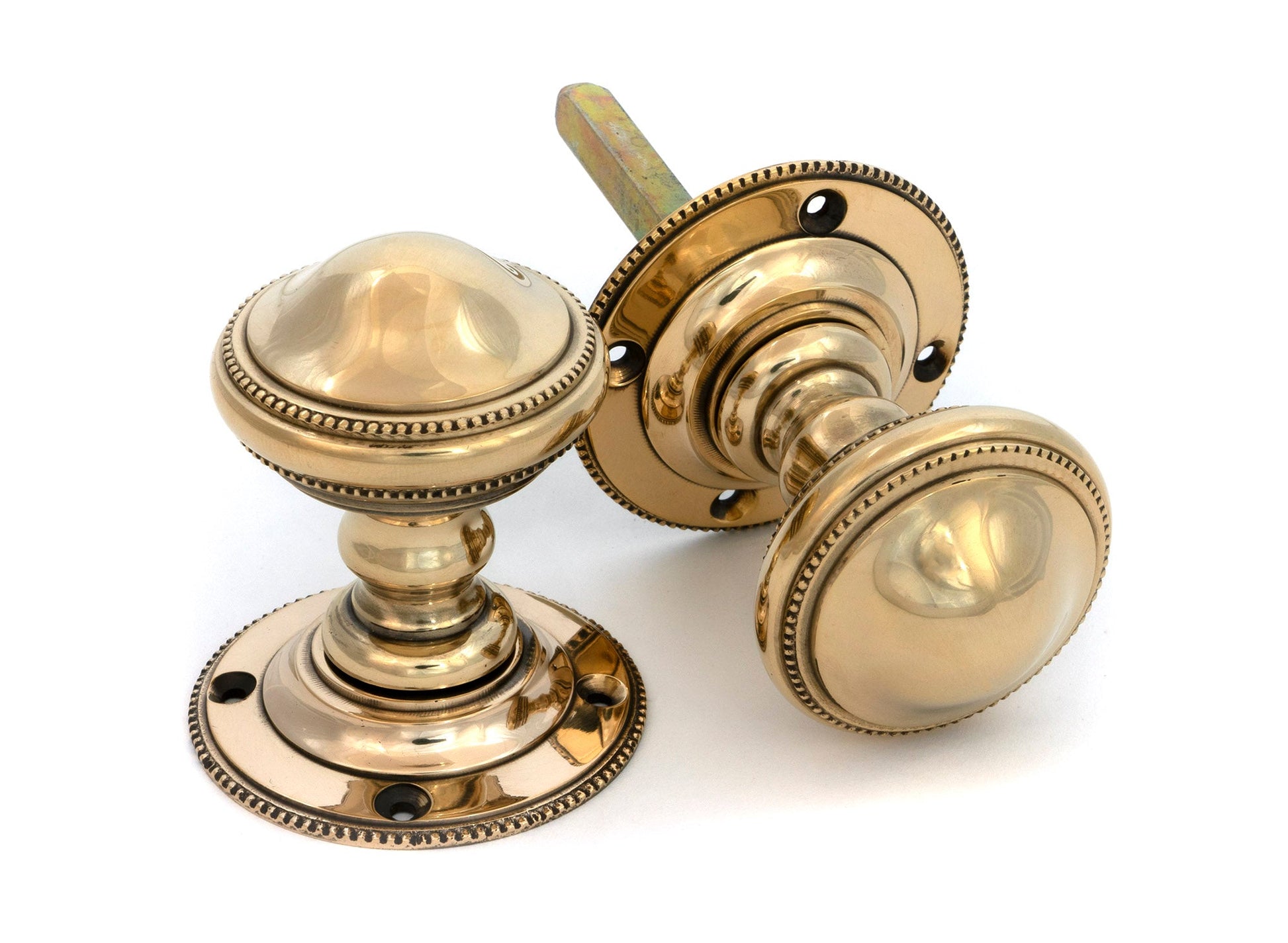 The image reveals a beautifully crafted pair of door knobs, each showcasing a timeless circular form with elegant beading gracefully encircling both the knob and the matching rose. The finely polished surface hints at the expert hand-finishing by skilled craftsmen, capturing the unmistakable lustre typical of solid brass. The overall appearance is at once classic and sophisticated, complementing a variety of traditional interior schemes with unrivalled style.