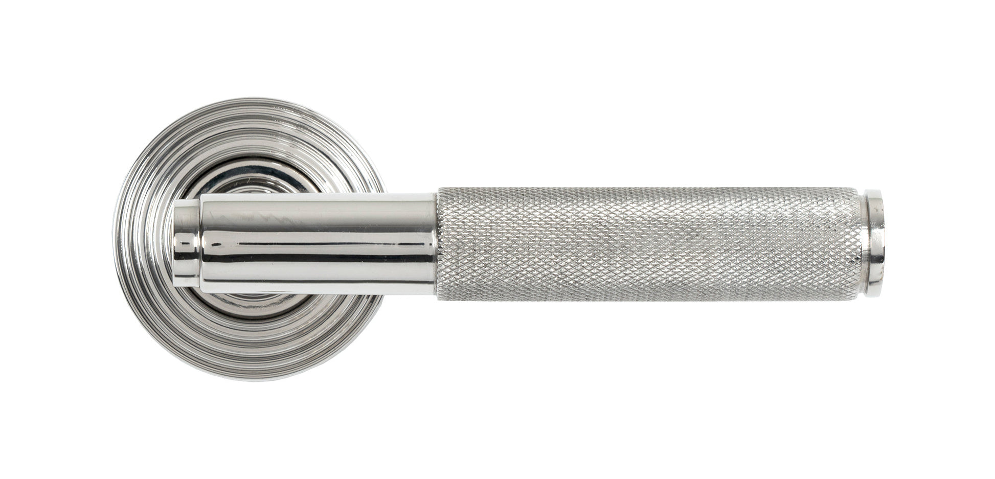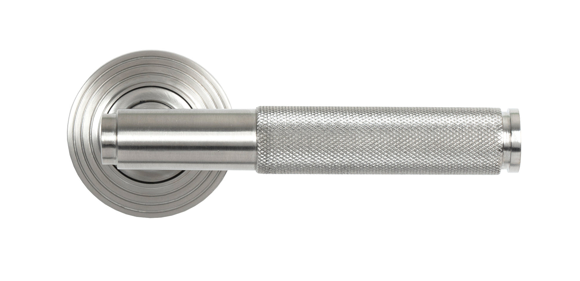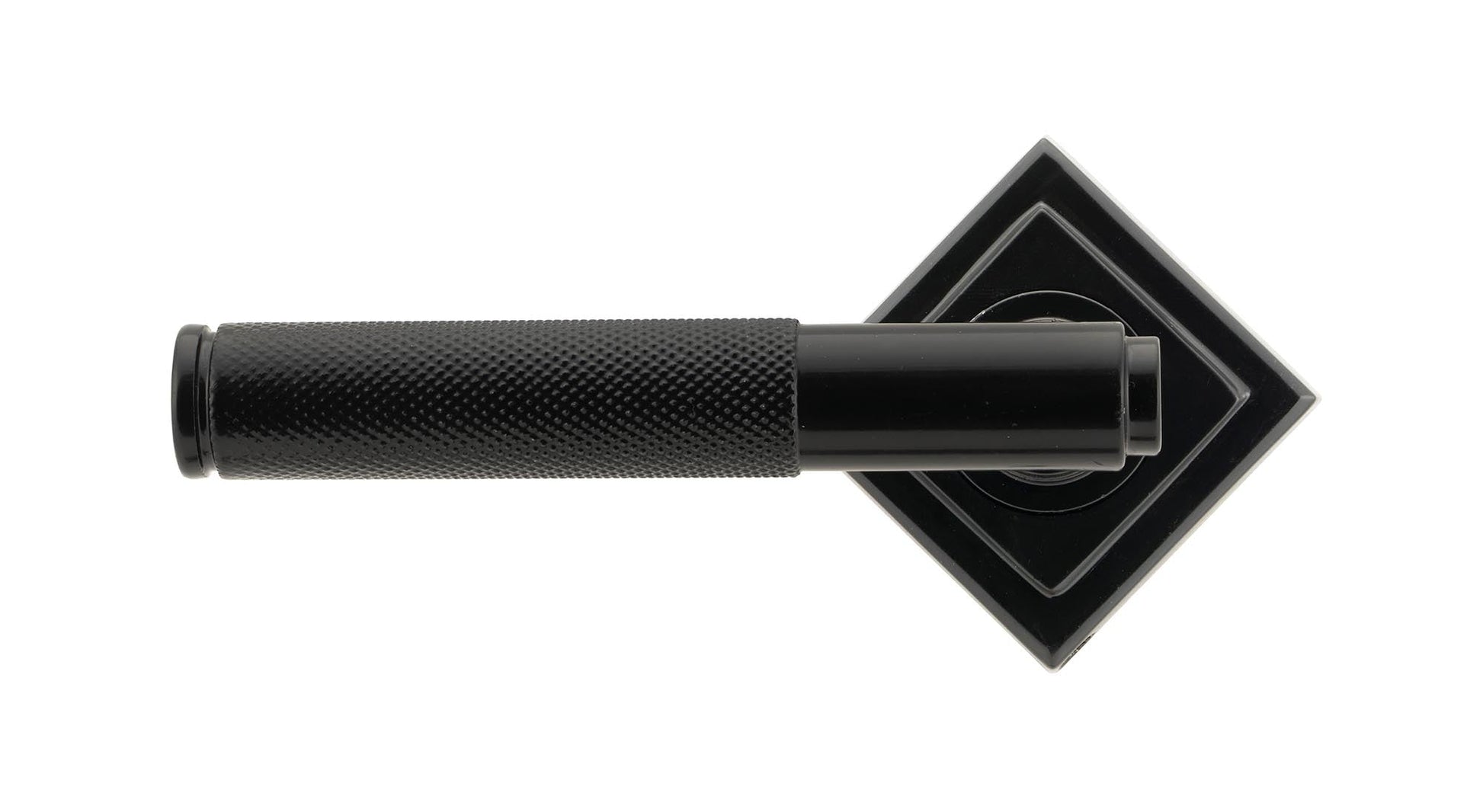 The product image showcases a pair of distinctly modern lever handles adorned with a striking diamond-patterned, knurled texture. The clean, industrial lines are emphasised by a sleek finish, lending a contemporary touch. The set is complemented by a stepped Art Deco rose detail, adding an elegant nod to traditional decorative elements while still being firmly rooted in present-day design trends.
