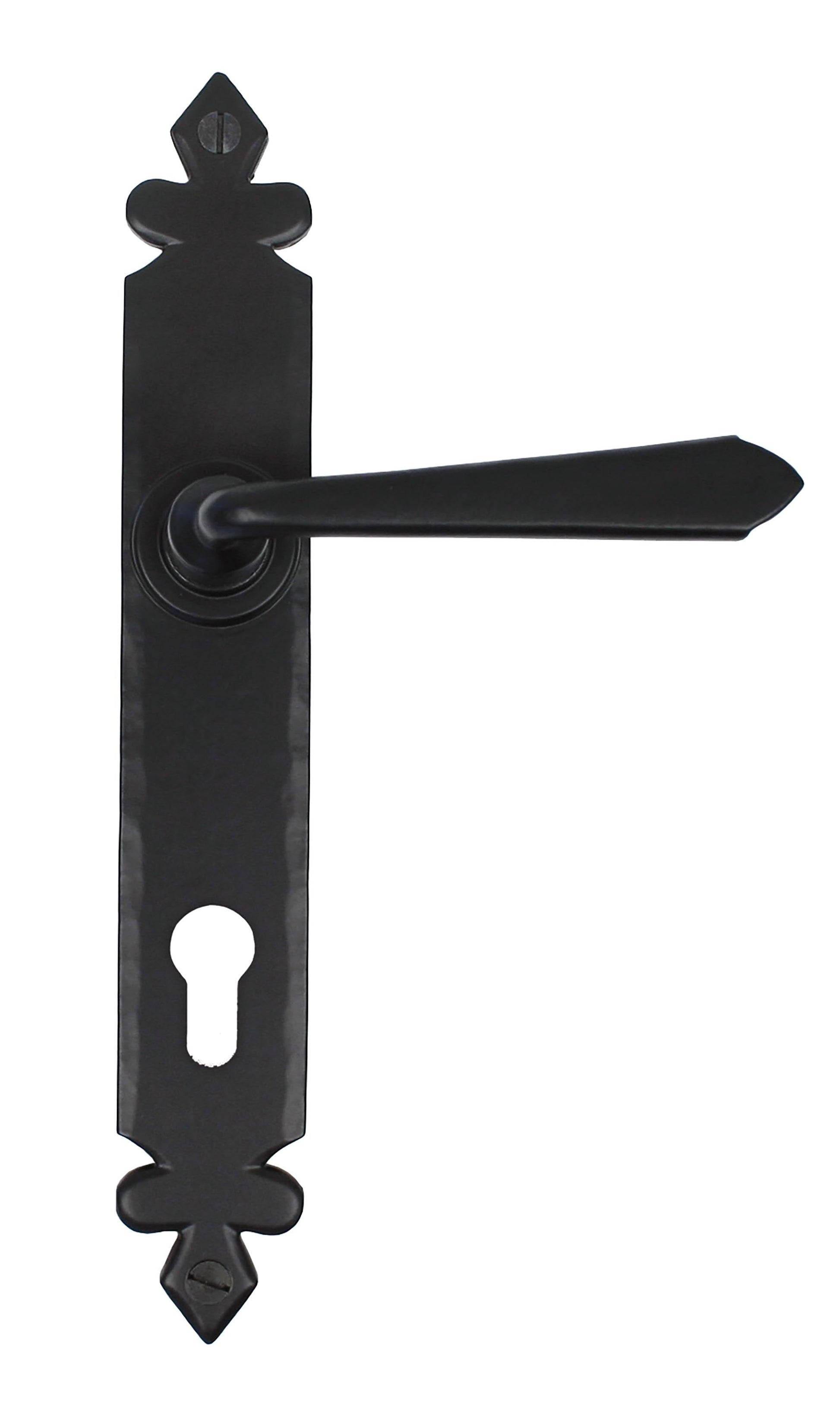 The From The Anvil Cromwell Lever Espag. Lock Set draws inspiration from classic Tudor motifs while embracing a sleeker, modern silhouette. Each handle in this espagnolette set is individually hand forged by skilled blacksmiths, giving every piece its own unique character. The set is ideal for external doors requiring secure multi-point locking and can also be used with French door kits alongside a euro cylinder. The handles are unsprung, yet the boss design ensures effortless use and an elegant touch to your entranceway.