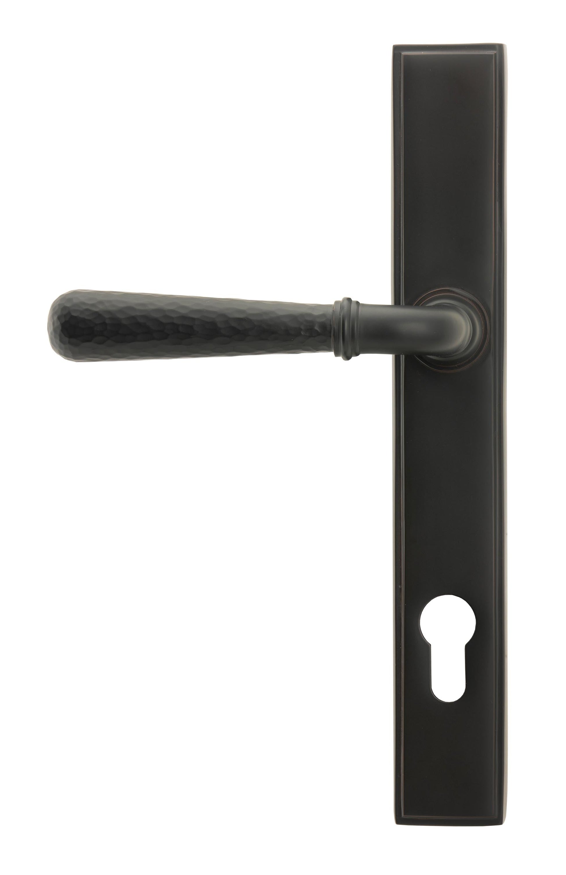 The From The Anvil Hammered Newbury Slimline Espag. Lock Set comes from a renowned British brand celebrated for its exquisite craftsmanship and high-quality ironmongery. Setting a benchmark in both style and substance, these striking handles merge classic techniques with contemporary design, making them a desirable choice for discerning homeowners and designers alike.