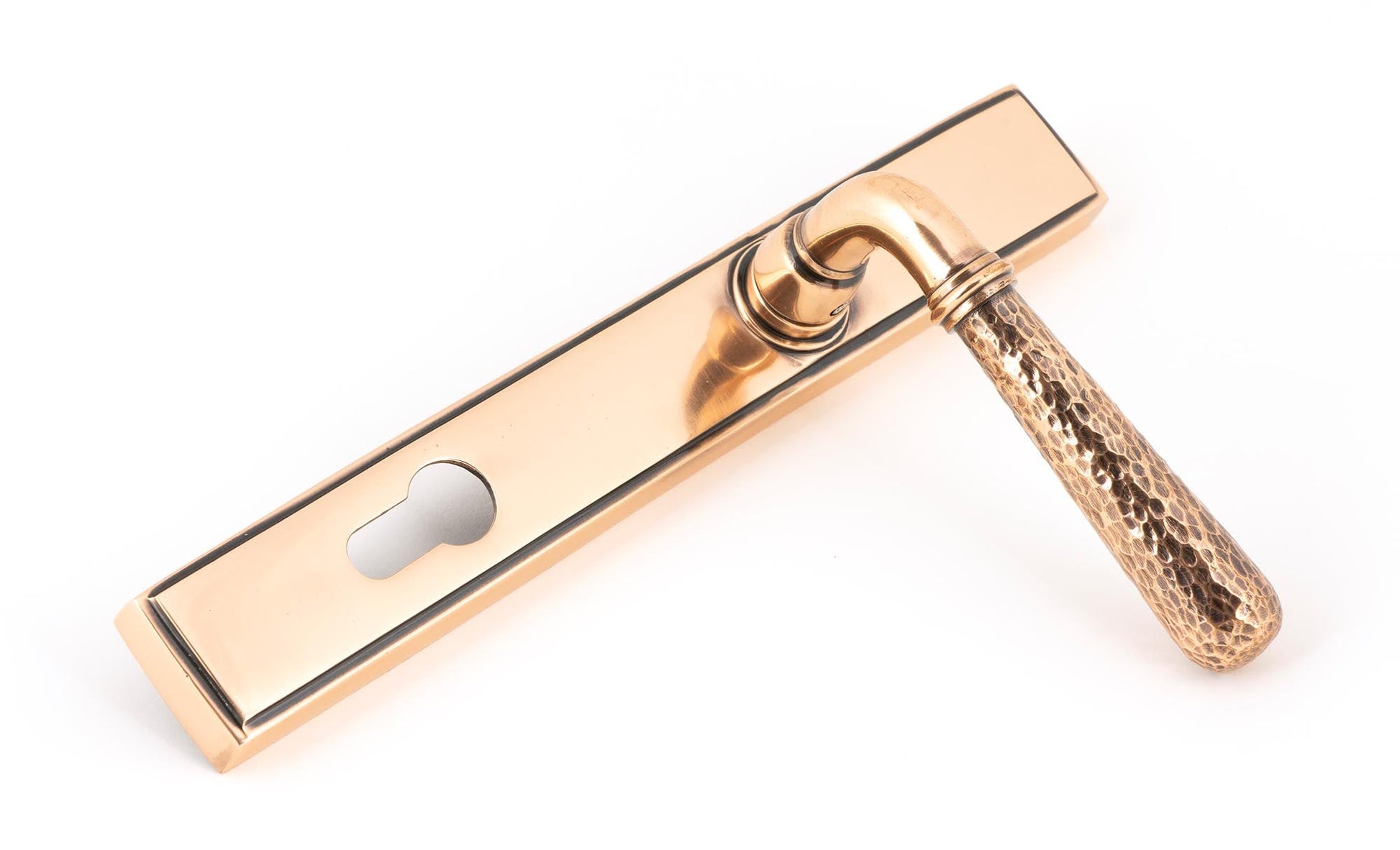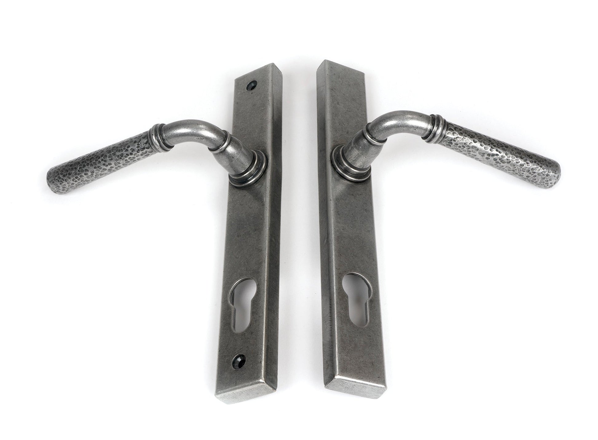 The From The Anvil Hammered Newbury Slimline Espag. Lock Set is carefully hand-forged by skilled Blacksmiths, creating a distinctive and robust espagnolette. Forged from solid brass, the Hammered Newbury lever handle is as attractive as it is resilient, perfectly suited to various settings throughout the home. The cleverly integrated double spring mechanism within the stylish boss ensures both elegance and durability—making this an ideal addition for external doors requiring multi-point locking.