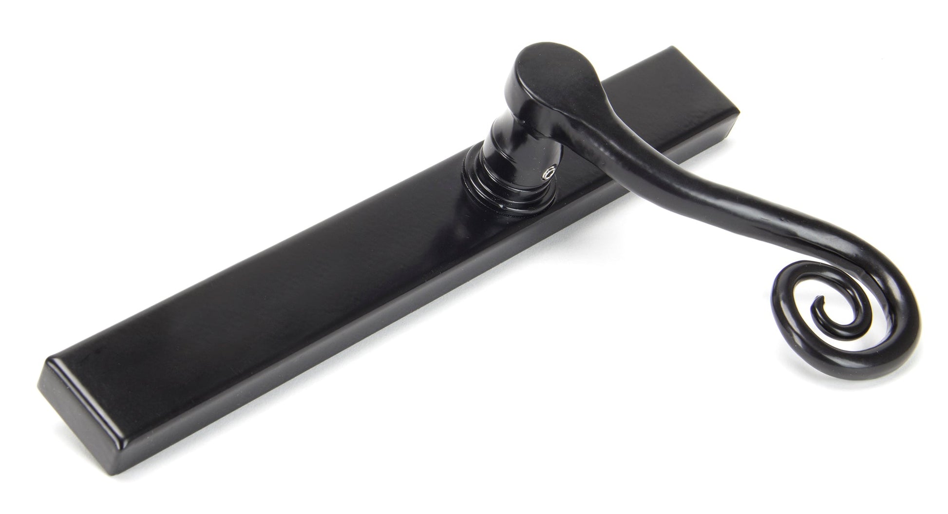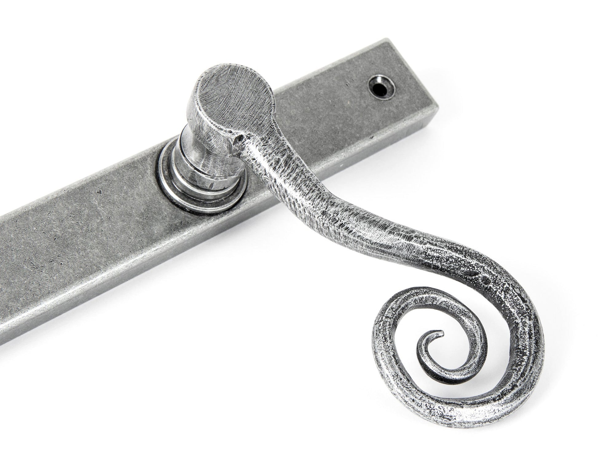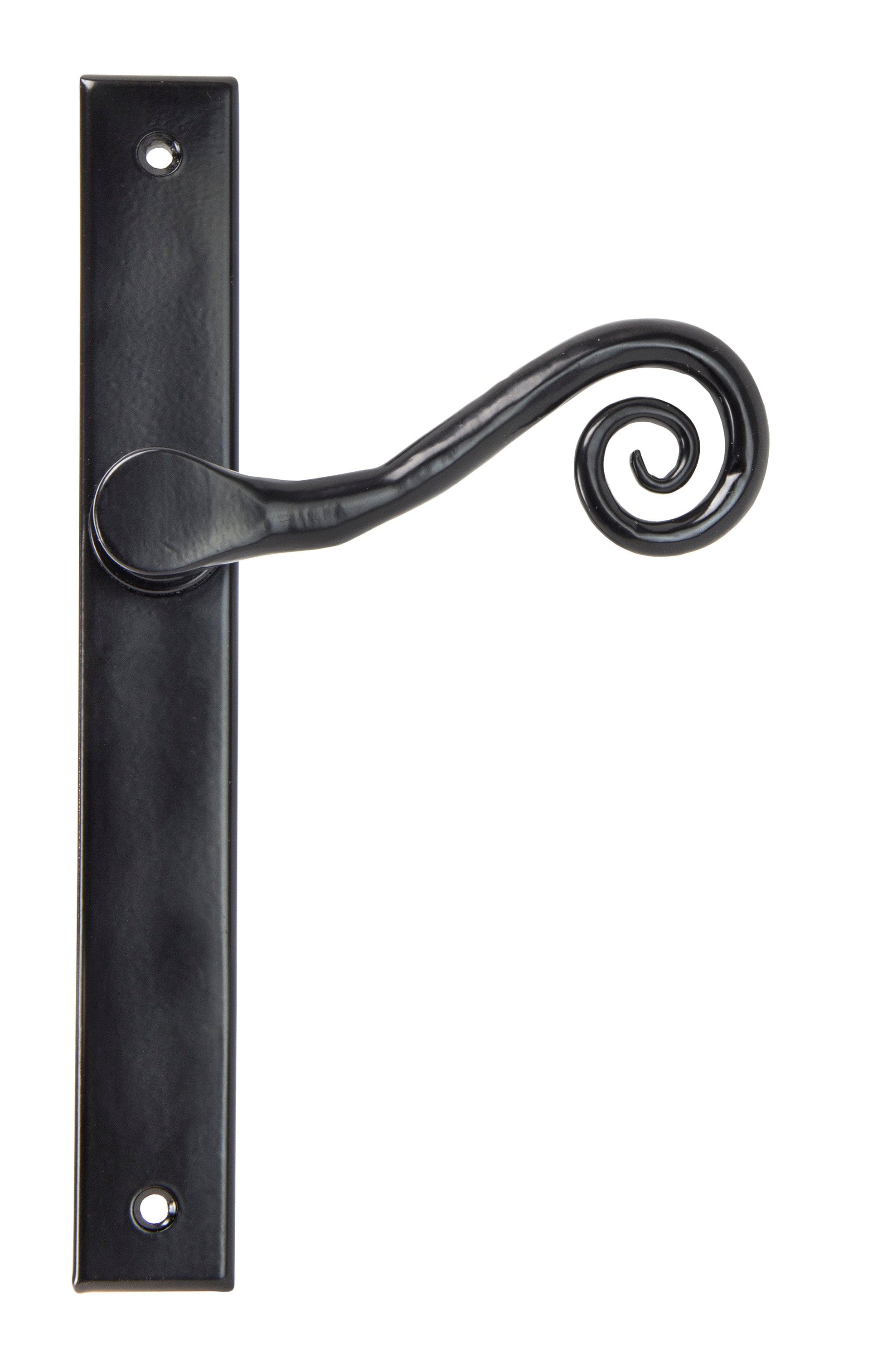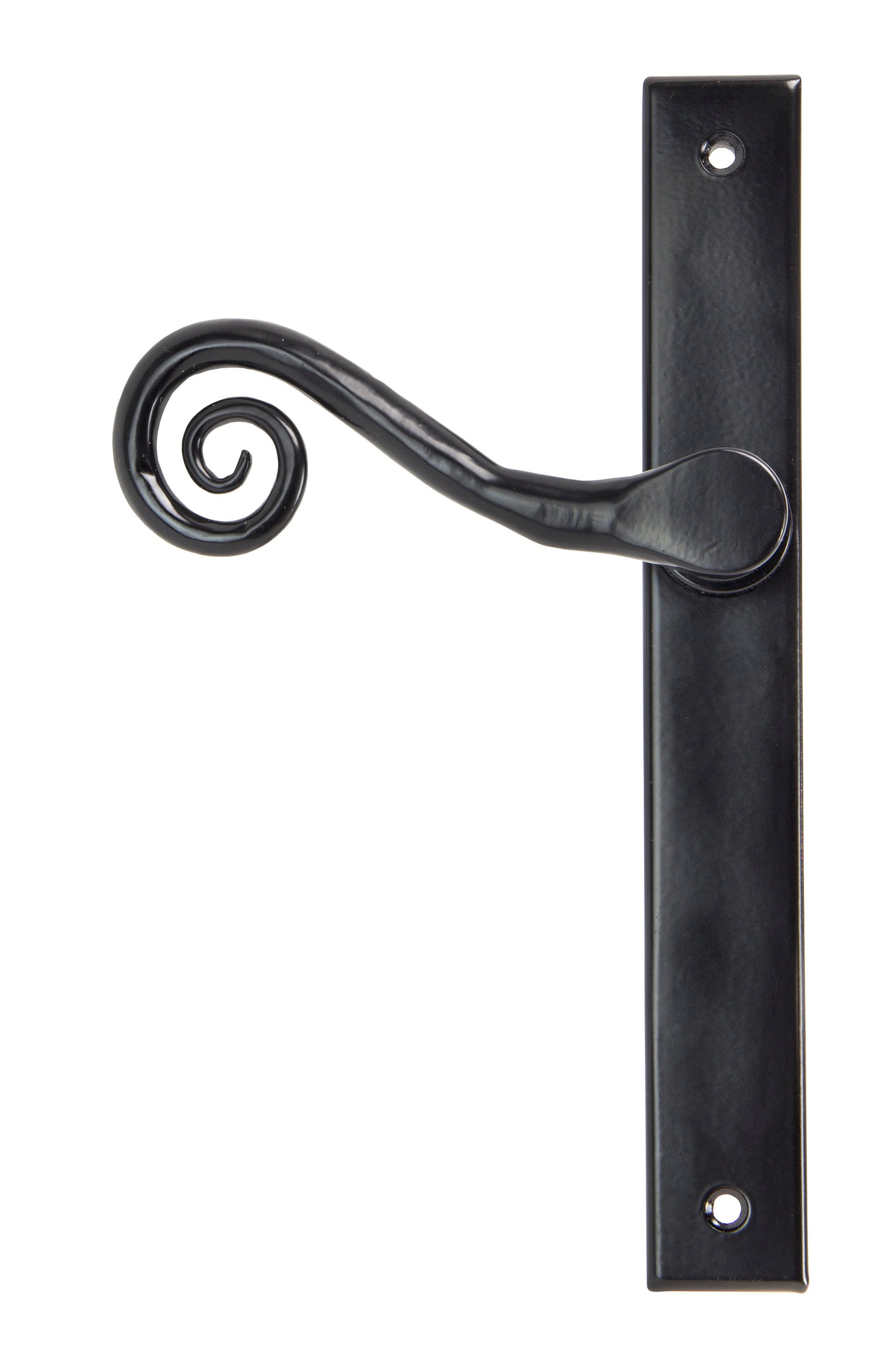 The From The Anvil Monkeytail Slimline Lever Espag. Latch Set exemplifies timeless design with a nod to traditional ironmongery, as evidenced by the swirling monkeytail formed by expert hands. Meticulously produced, this espagnolette set is expertly engineered for external doors where multi-point locking is essential. Its robust double spring, thoughtfully incorporated into the boss, achieves a perfect blend of elegance and reliability in daily use.