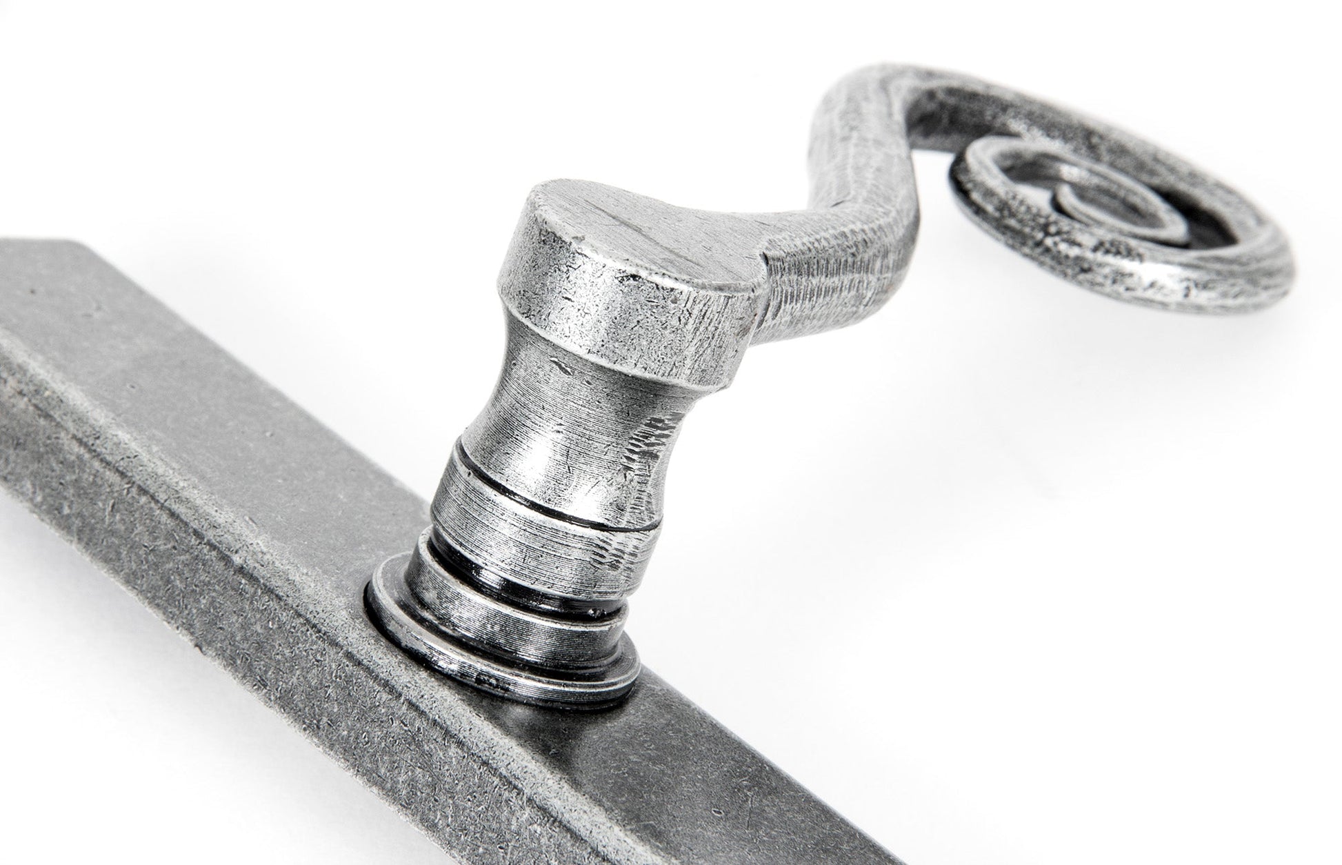 In the image, the handle is exquisitely finished, displaying a delicate, hand-forged curly monkeytail detail which gives it a strikingly historic and elegant look. The surface features subtle hammered texturing, evoking the craftsmanship of skilled blacksmiths, while the silhouette curves gracefully, promising both visual charm and comfortable grip.
