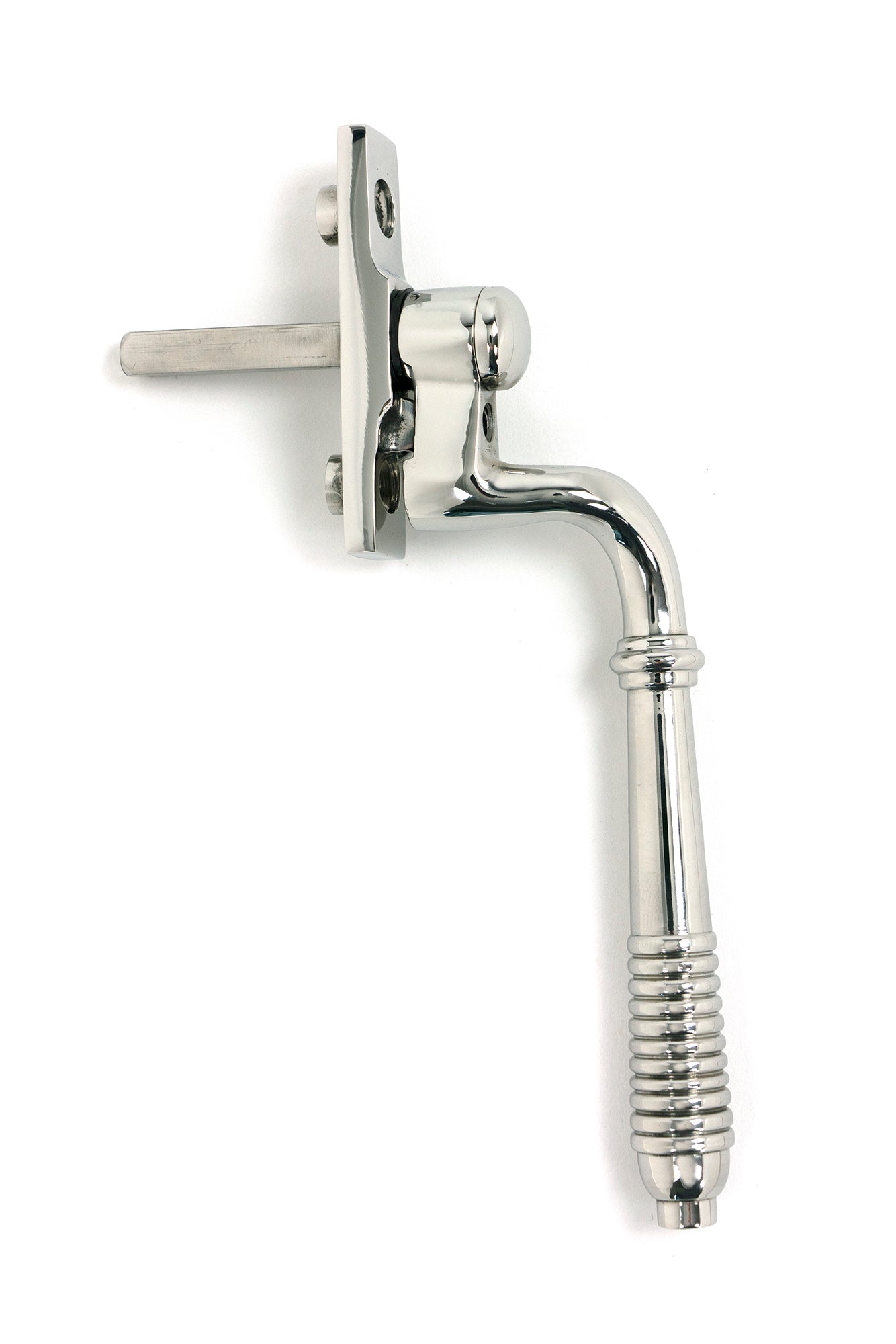 The product image showcases an elegant espag handle, gracefully curved with a refined, reeded design on the end. The handle’s detailed ridges reflect the precise hand finishing skilfully undertaken by expert craftsmen, and its clean lines and classic regency aesthetic contribute a sophisticated touch to any window. The lustrous appearance adds a statement feature, enhancing contemporary and traditional décors alike.