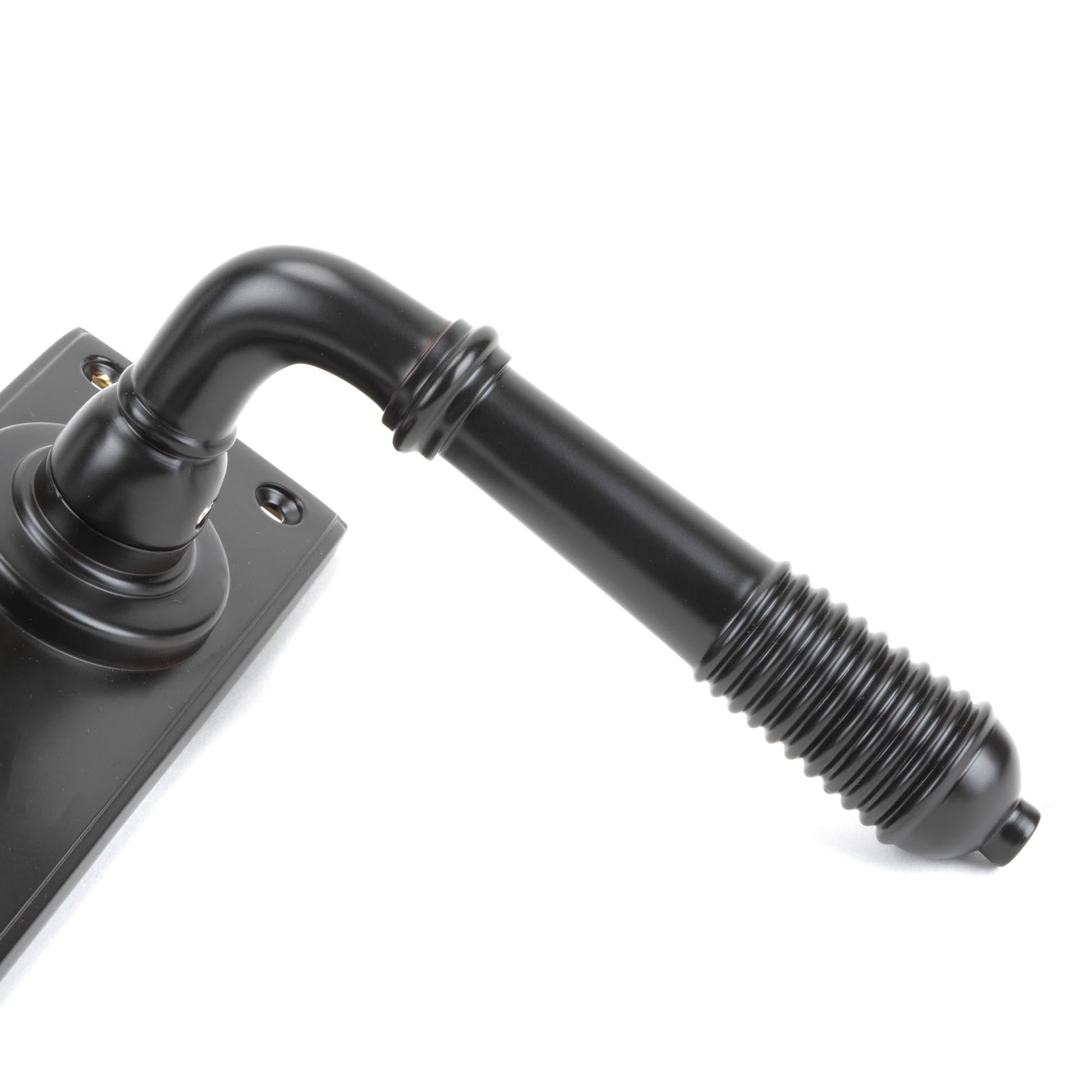 The image showcases an expertly crafted pair of lever handles, each adorned with a beautifully detailed reeded end that catches the light along its length. The subtle decorative grooves accentuate meticulous hand-finished techniques, testament to the artisan skill behind every piece. The sophisticated boss and gently arching levers lend a timeless feel, making this an ideal choice for those who value enduring design.