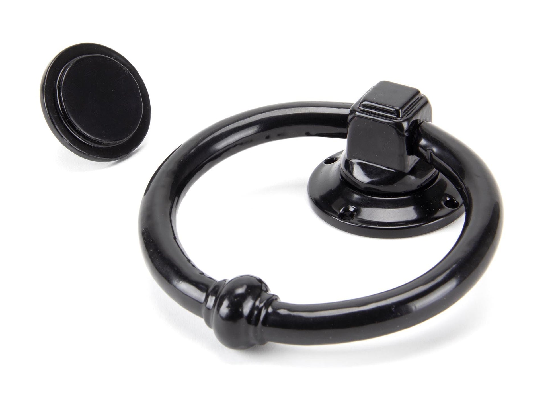The image reveals a graceful and timeless form, featuring a classic knocker ring with subtle, hand-forged detailing. The expertly hammered finish catches the light beautifully, showcasing the unique textures created by the blacksmith’s hand. Its surface boasts a thoughtful blend of traditional flair and contemporary sensibility, promising a striking first impression for any doorway.