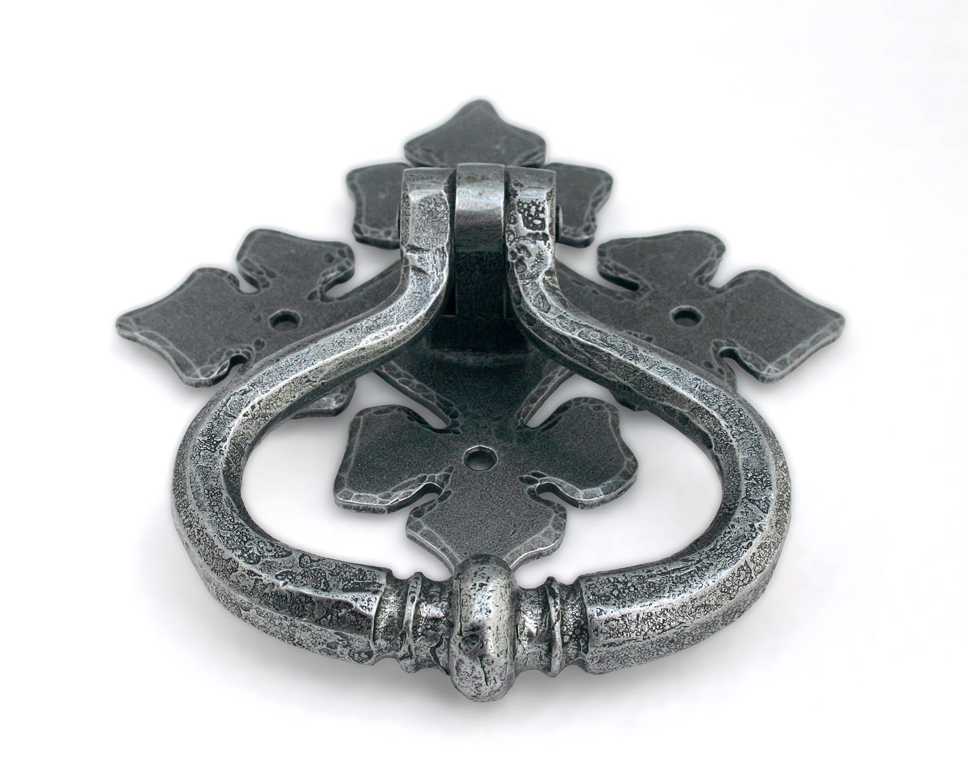 The image displays an elegant ring turn handle with intricate, decorative detailing along the face of the ring and coordinating backplate. Echoes of timeless Shakespearean style are captured in the ornamental curves and textured elements, which create a charming focal point for any door or gate.