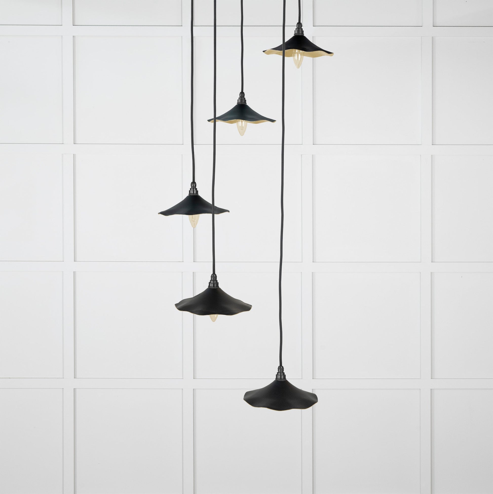 Visually, this pendant cluster displays an elegant arrangement of five matching pendants, each suspended at a different height from a spacious, rounded ceiling rose. The gentle, organic curves of the shade echo forms found in nature, scattering beams of light in fluid, artistic patterns. The smooth brass surface catches the eye, radiating a sophisticated, contemporary aesthetic that beautifully complements both classic and modern interiors.