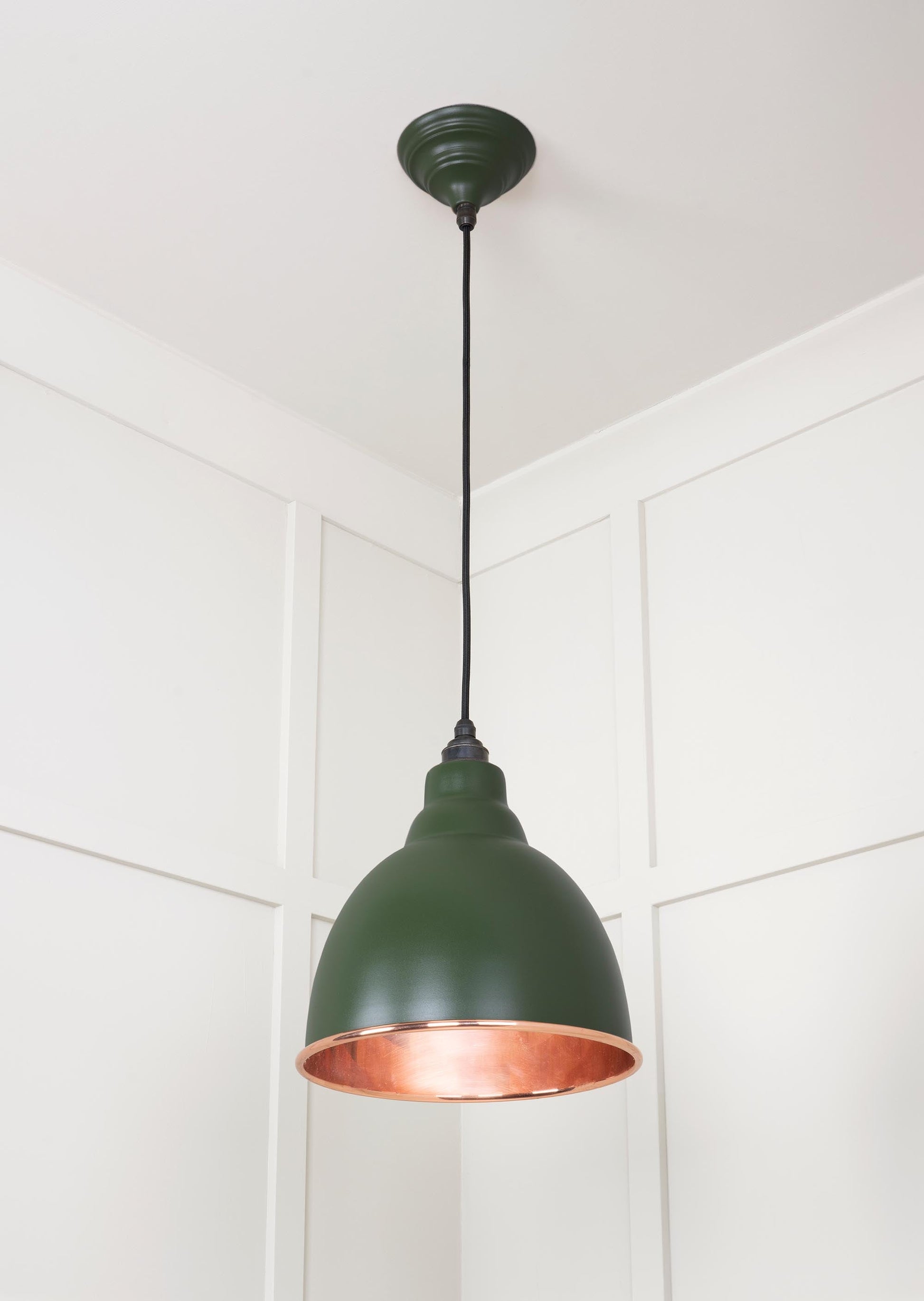 The product image showcases the Brindley Pendant in a smooth copper finish, gleaming with a warm, contemporary glow. The clean, curved silhouette and reflective surface capture and enhance ambient light, creating striking visual interest. Suspended by a sleek black fabric cable, this pendant exemplifies modern elegance while maintaining a timeless, handcrafted charm.