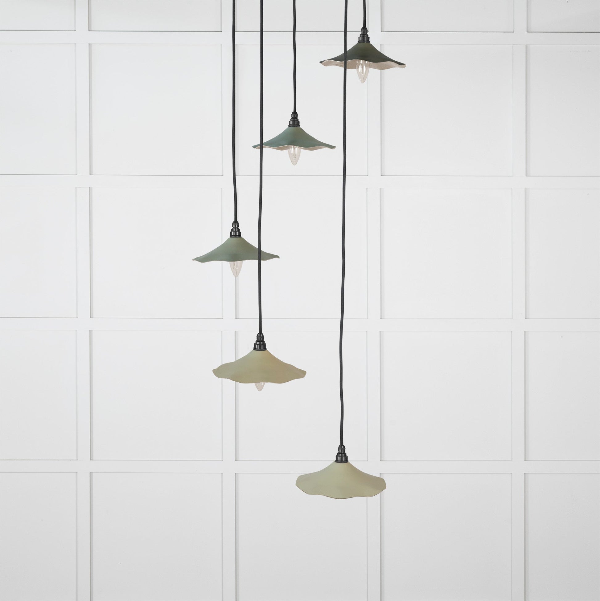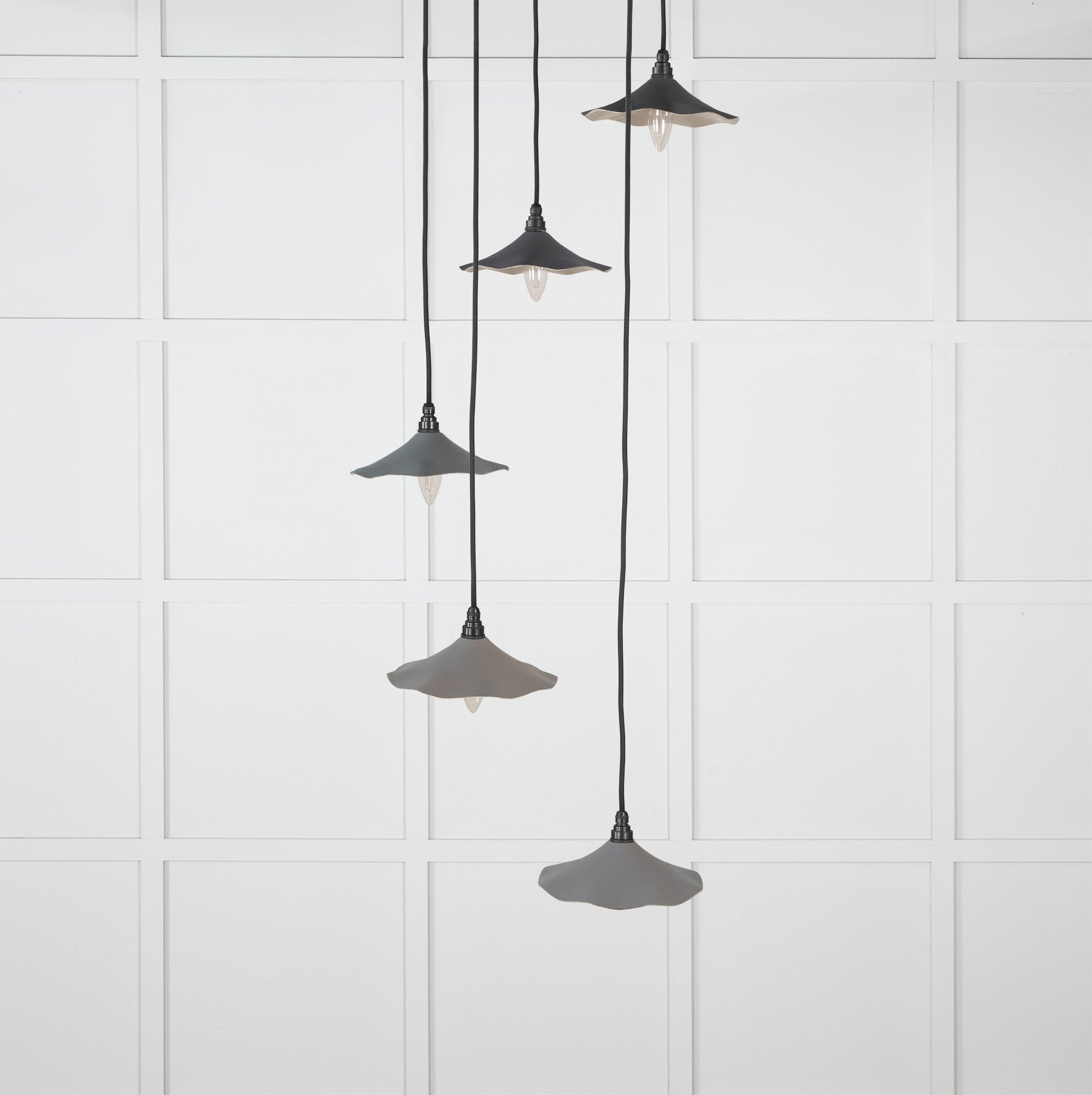 - Features five matching pendants suspended at different heights for a dynamic effect