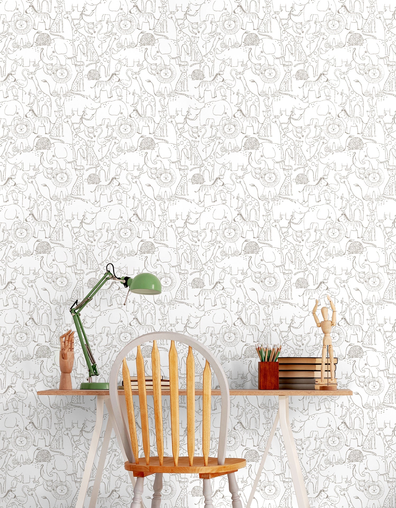 In the image, whimsical, hand-drawn outlines of animals gently overlap along a soothing grey backdrop. Each doodle meanders seamlessly into the next, bringing a sense of adventure and gentle movement to the room. The minimalist artistry balances energy and calm, making it perfectly suited to both tranquil bedrooms and spirited playrooms.