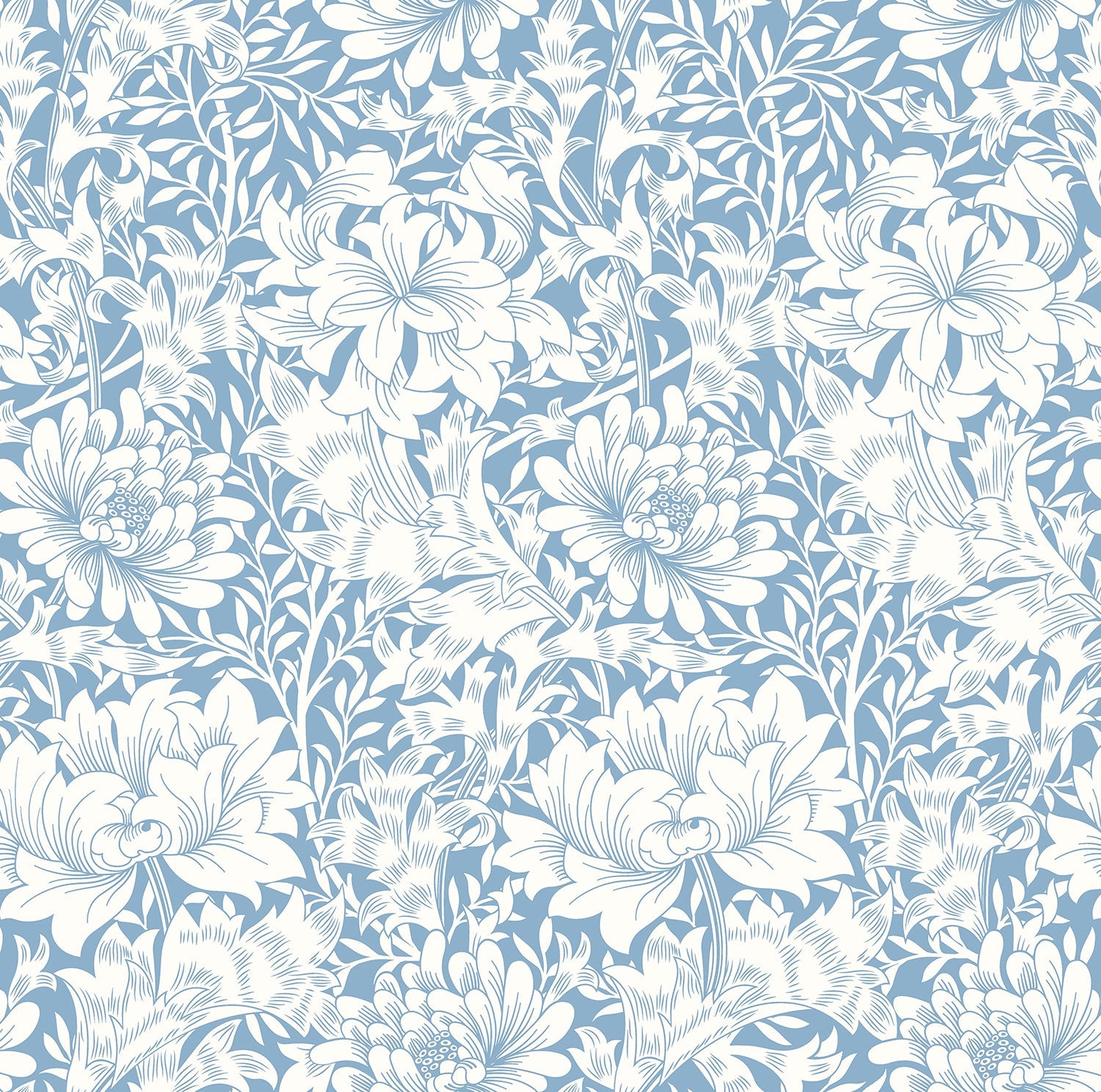 The Hoopla Walls Chrysanthemum Wedgewood Blue wallpaper offers an ornate and bold floral design, featuring large chrysanthemum flower heads and leaves entwined over a fine, repeating background pattern. This wallpaper is perfectly suited for anyone seeking to transform their space with a touch of dramatic elegance and charm, effortlessly combining classic inspiration with contemporary flair.