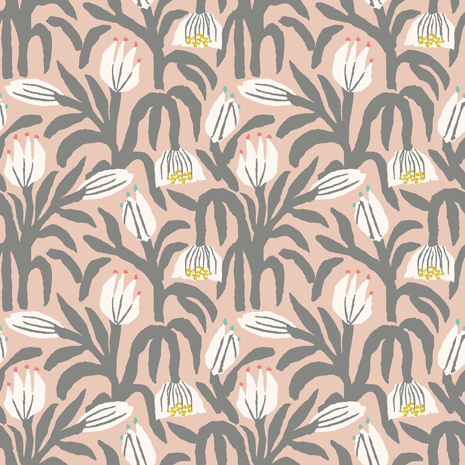 The image boasts a delightful burst of colour, showcasing abstract, arching leaves and large, chunky flower heads in a graphic display. Pops of pastel tones are artfully scattered throughout, contributing to an uplifting and welcoming atmosphere. These playful botanical motifs are set against a light backdrop, reflecting a naïve and joyful interpretation of nature that feels both contemporary and timeless.