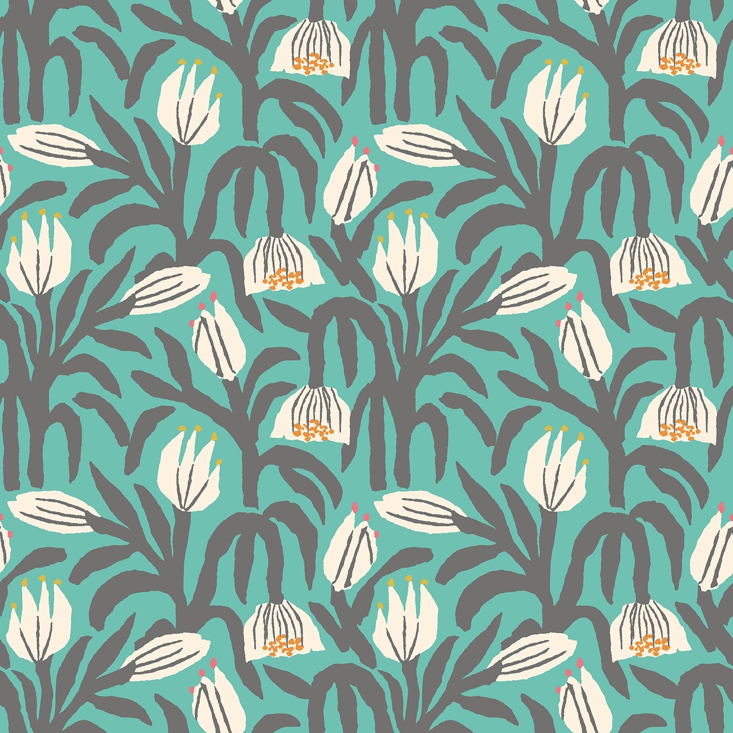 The featured image presents a charming, playful scene: chunky flower heads and arching leaves unfurl together in cheerful movement, complemented by splashes of lively teal blue. Pops of contrasting colour infuse freshness, while bold, clean outlines create a graphic, illustrative impression that captures the spirit of naïve art. This wallpaper’s vibrant visual impact would instantly uplift any room, providing a striking yet harmonious backdrop that appeals to both adults and children.
