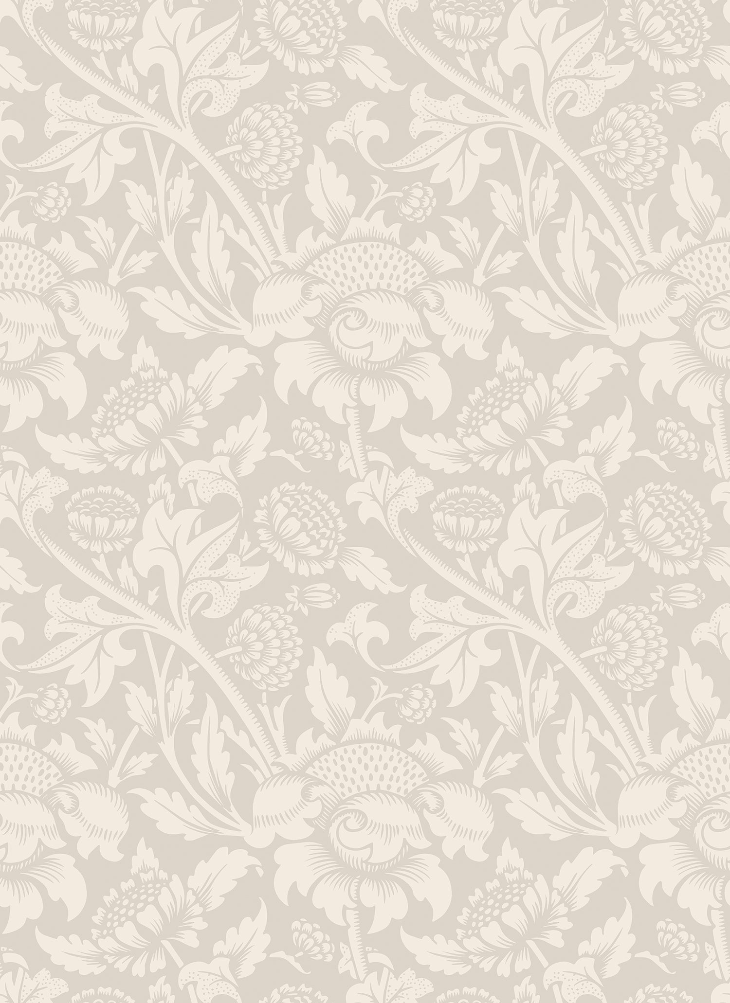 The image unveils a mesmerising wallpaper adorned with intricate, sweeping vines and generous sunflower-like blossoms, all rendered in subtle stone grey tones. The motif gracefully dances across the wall, elevating any interior with its fusion of classic beauty and botanic charm. It beautifully captures the interplay of bold, natural forms and soft, understated shades, offering a luxurious backdrop that complements both vintage and contemporary décors.