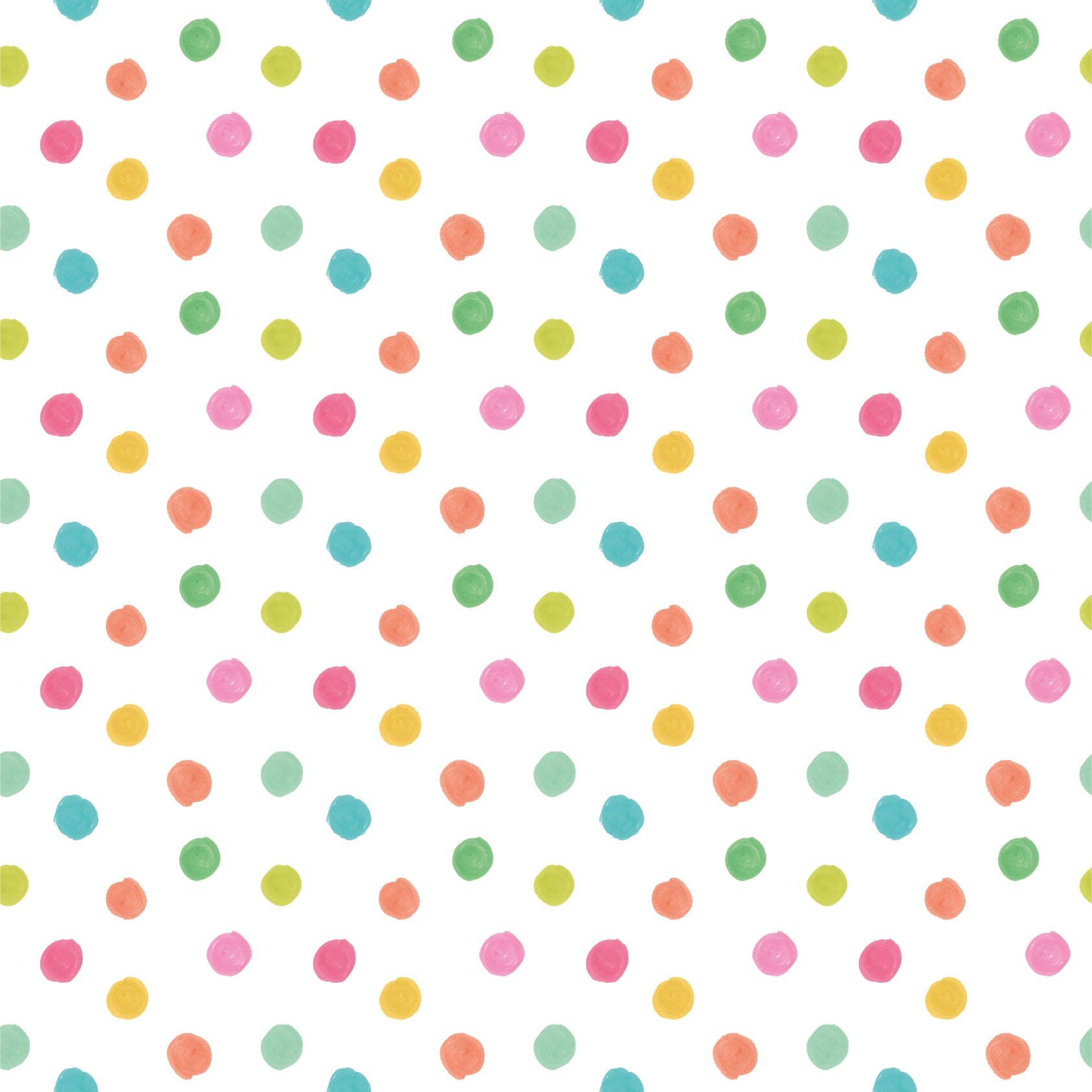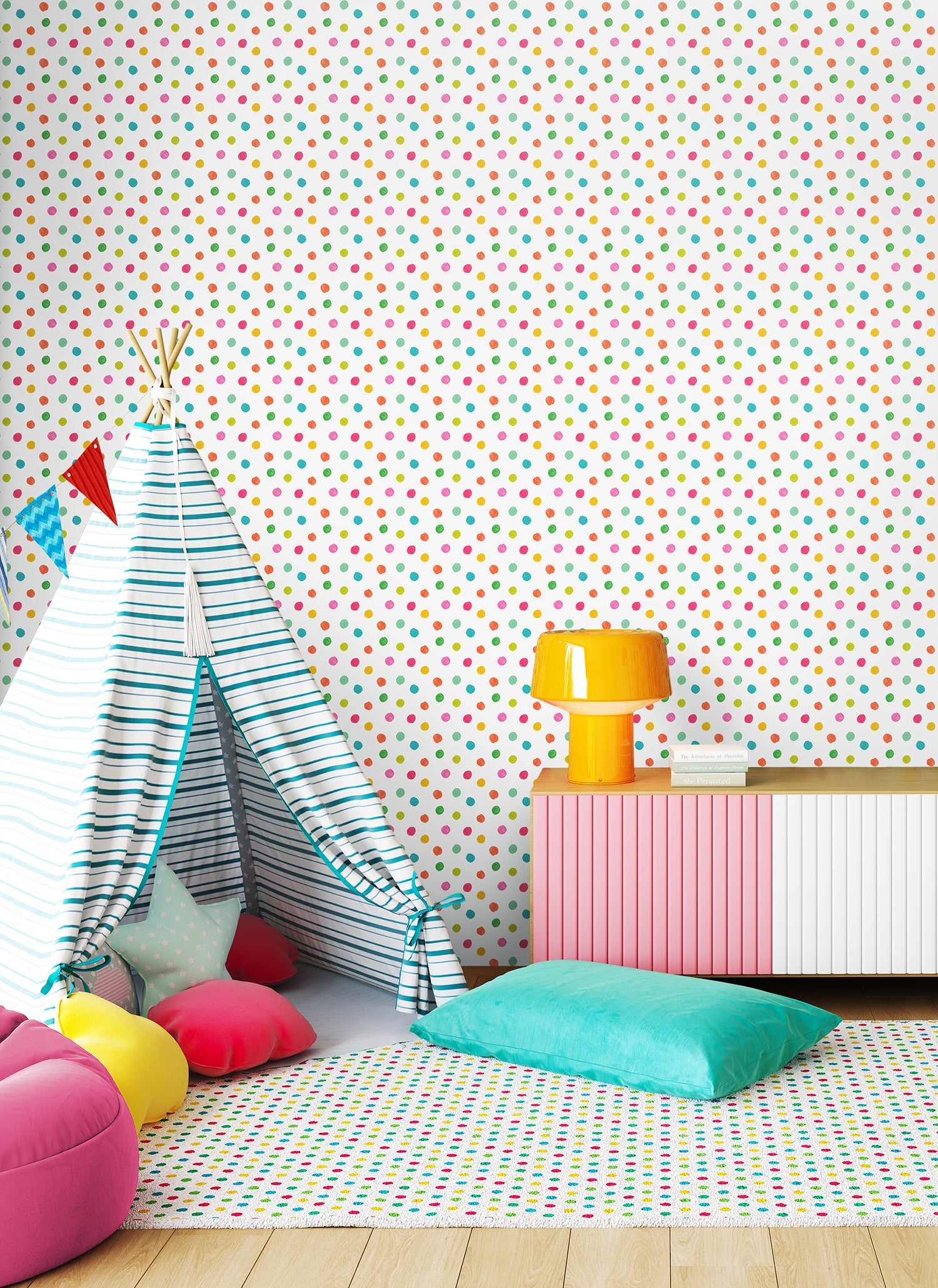 The image captures a cheerful and inviting scene, showcasing a wall adorned with scattered, textured polka dots in a medley of soft, fruity pastel tones. The dots appear delightfully random, lending a sense of spontaneity and joy to the space. This playful wallpaper is styled in a room designed for children, complete with subtle, modern décor and a light, welcoming atmosphere.