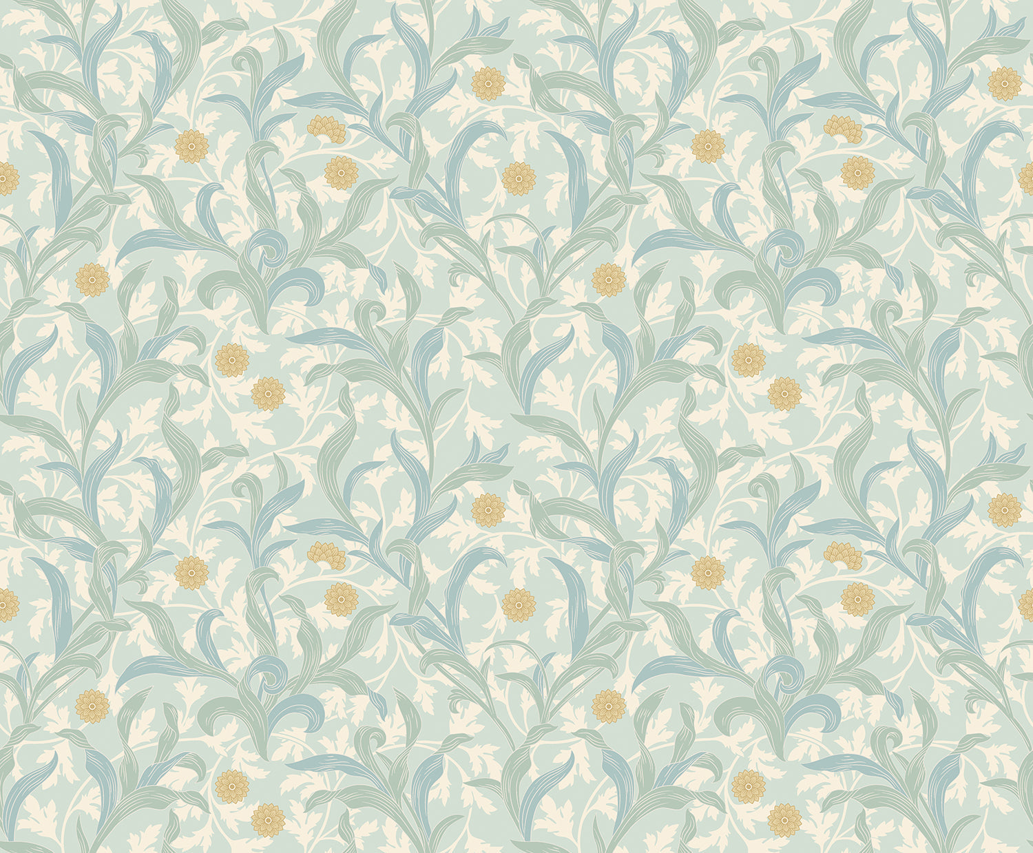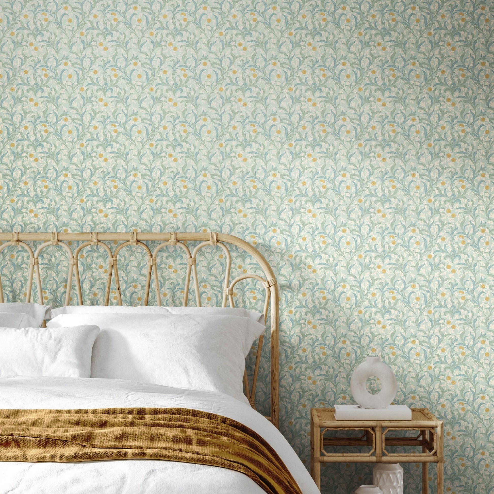 In the image, the wallpaper displays a serene duck egg blue background embellished with wisps of small, dainty floral trails. Each delicate blossom appears to unfurl upwards, their slender stems and intricate petals creating an enchanting sense of movement across the wall. The soft interplay between the pale blue shade and the gentle white and natural floral outlines lends an airy, inviting atmosphere to the room, allowing the pattern to both uplift and soothe.
