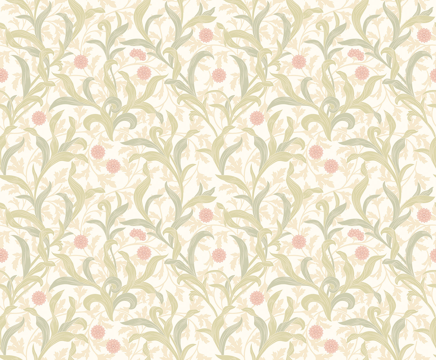 The image reveals a mesmerising display of delicate florals gently meandering upwards, each curve and swirl echoing natural movement. Muted sage tones mingle with soft coral accents, creating a sophisticated harmony that draws the eye and complements a variety of décor styles. The gentle interplay of colour and artistry instantly uplifts any space, bringing life and understated elegance to your walls.