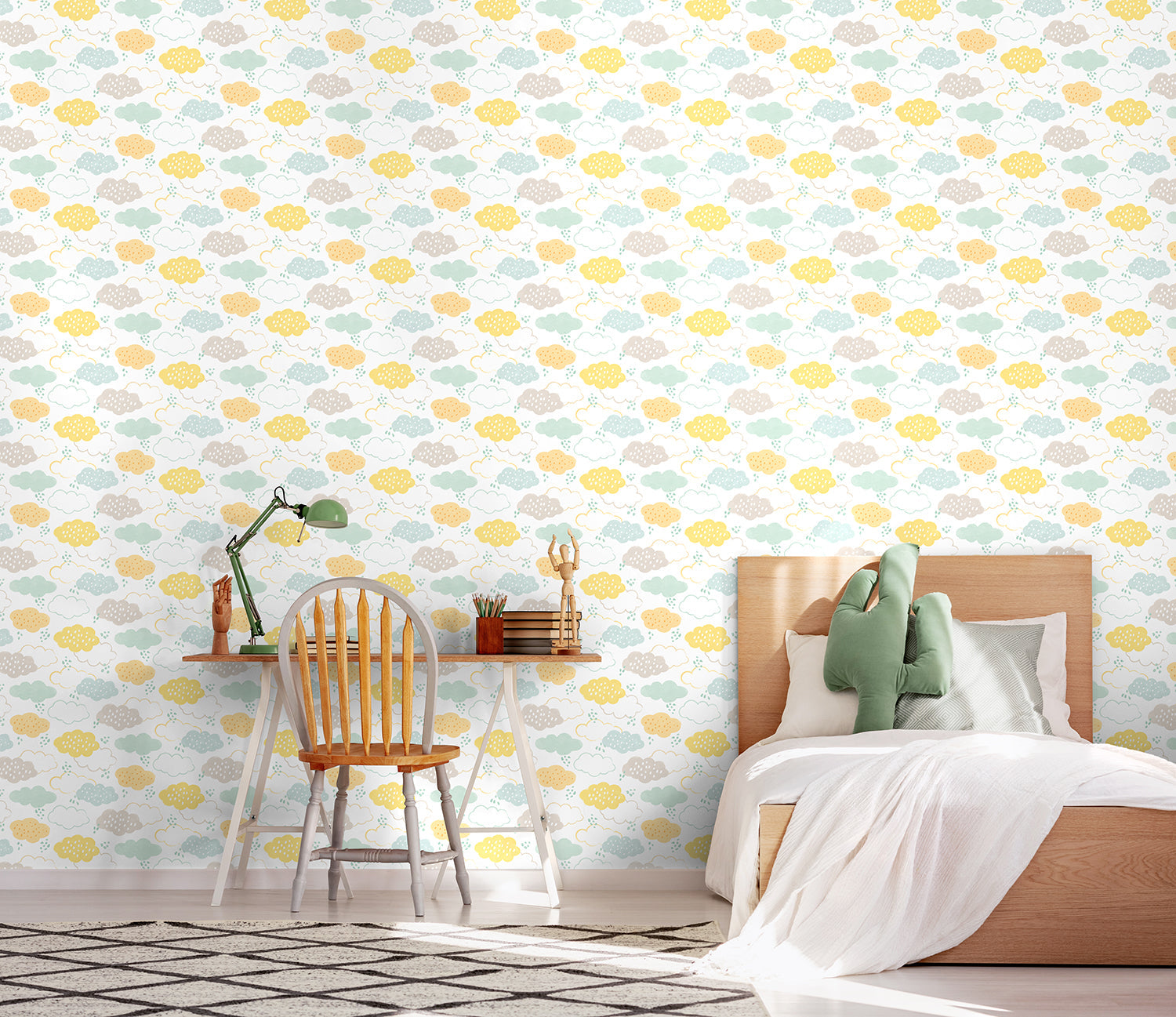 The image showcases an enchanting blend of soft, dreamy clouds drifting across a mellow lemon fizz backdrop. The clouds are delicately rendered with watercolour brushstrokes, giving a gentle and almost ethereal quality to the scene. Subtle dots are scattered throughout, reminiscent of tiny stars or raindrops, which add a sense of whimsy and tranquility to any room.