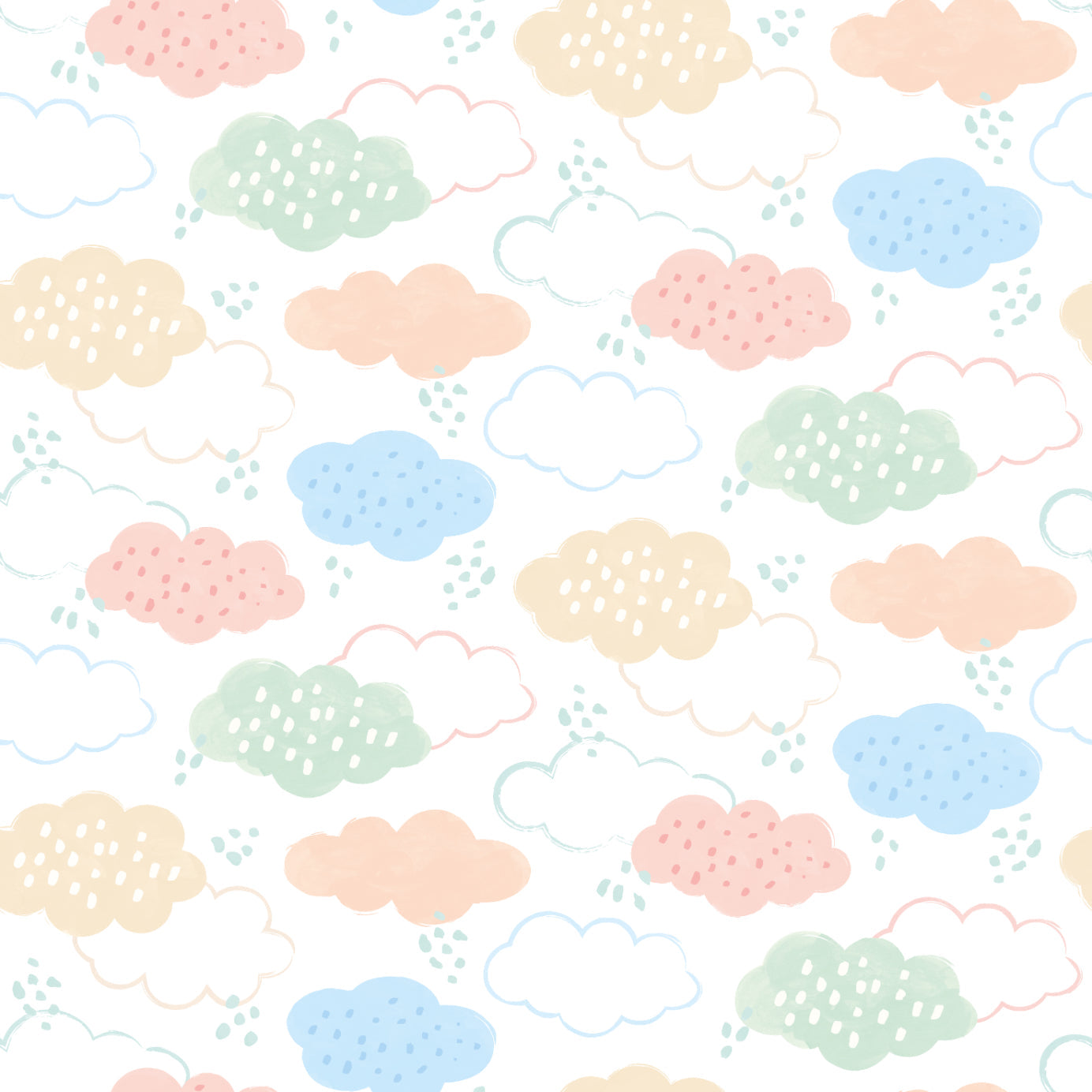 The image features a serene watercolour sky, filled with soft, billowing clouds that float gracefully across a light pastel backdrop. Scattered throughout, playful dots evoke the gentle fall of raindrops or distant stars, contributing to a dreamy and whimsical atmosphere. The soothing blend of gentle pinks and pale hues brings to mind a peaceful dusk, offering a touch of calm and creativity to your little one’s favourite spaces.