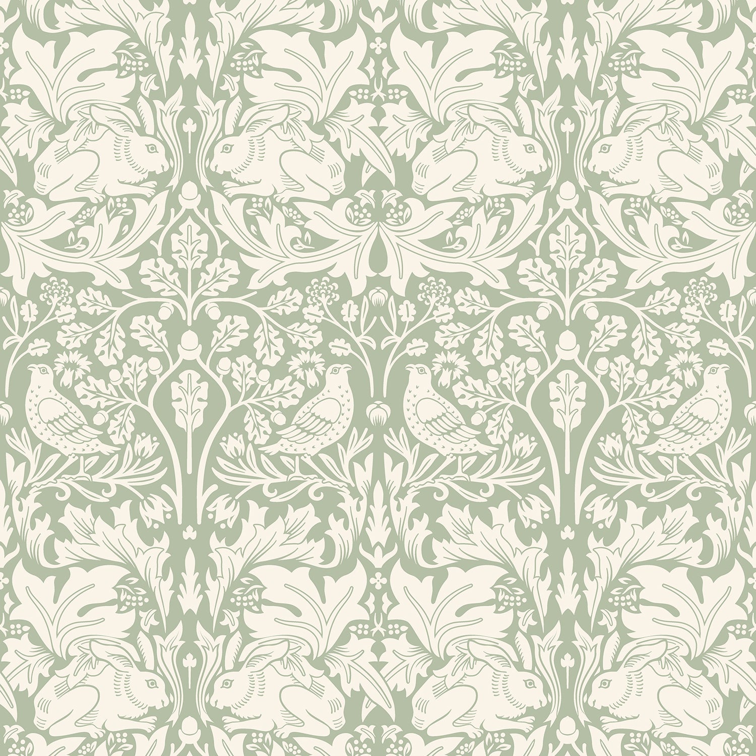 The image displayed on the Forest Rabbit Sage Green wallpaper features a captivating, hand-drawn landscape teeming with whimsical rabbits, charming birds, and delicate leafy foliage. The serene sage green background creates a calming atmosphere, while the intricate details of the woodland scene draw the eye and inspire the imagination. Gentle tones work harmoniously to evoke a peaceful ambiance ideal for both modern and traditional homes.