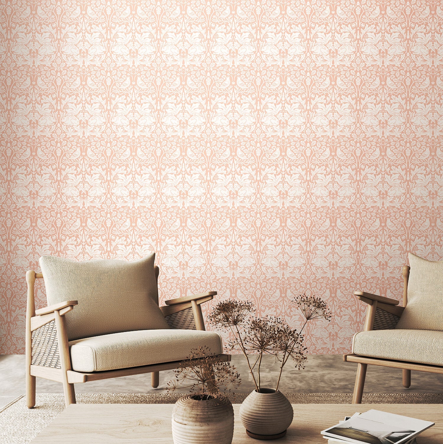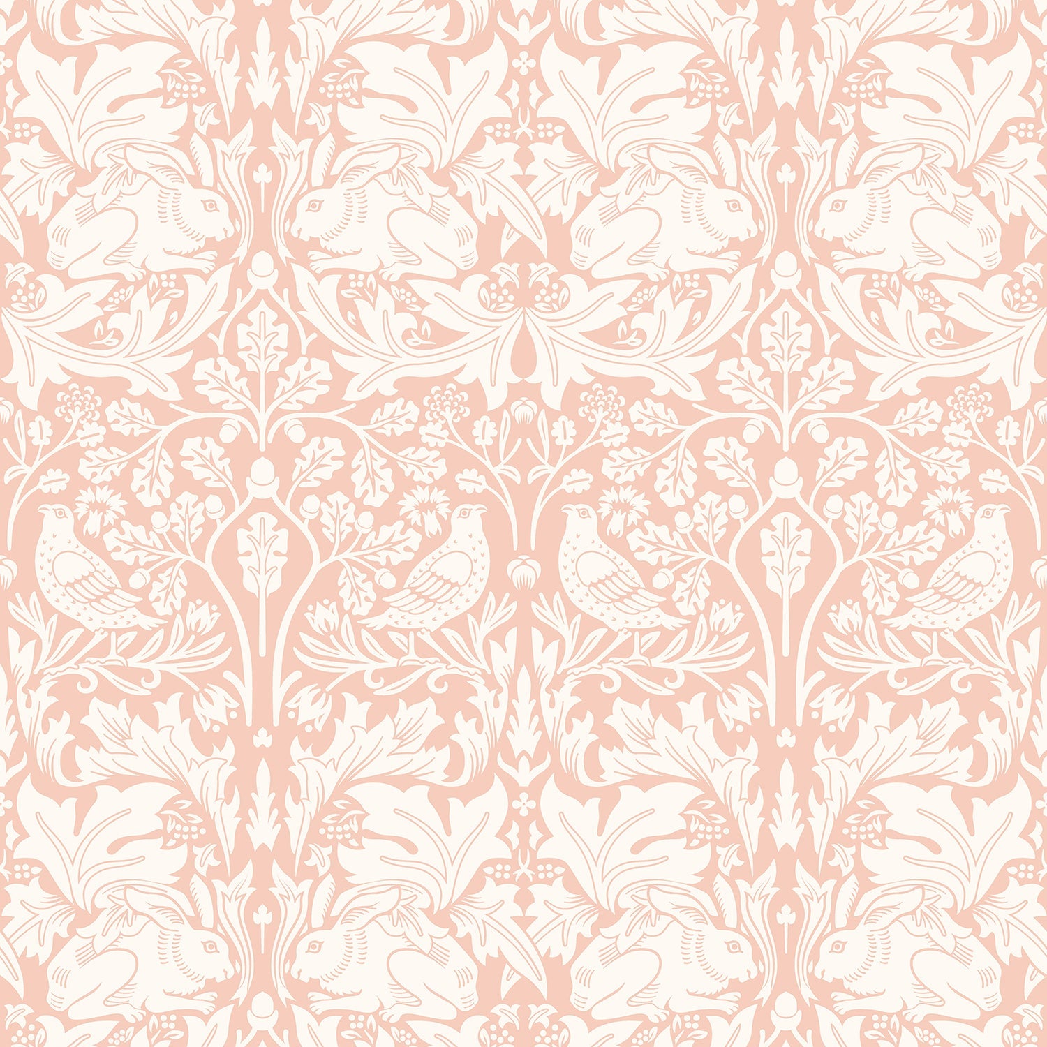 The wallpaper’s design showcases a delightful scene: hand-drawn rabbits darting among lush foliage, intertwined with songbirds amidst flourishes of leafy greenery. Set against a gentle soft pink background, the illustration introduces an air of tranquillity and whimsy, evoking the soothing essence of a woodland glade just as dawn breaks. The overall look is elegant yet playful, with the tonal pink palette lending warmth and comfort to any room.
