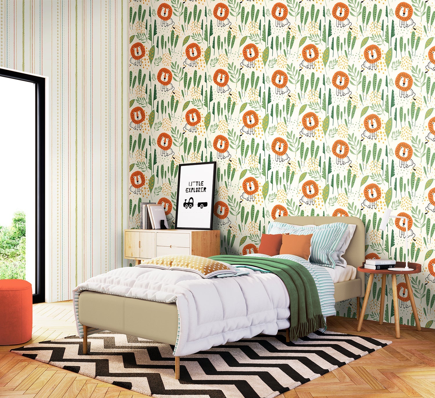 The Hoopla Walls Happy Lion Ginger wallpaper brings joy and creativity to the heart of your home. Designed to capture a playroom or bedroom’s natural energy, this wallpaper offers a safari-inspired haven where children can let their imaginations roam freely. The combination of friendly characters and lively colour enhances cosiness and creates a space where little ones feel safe and inspired.