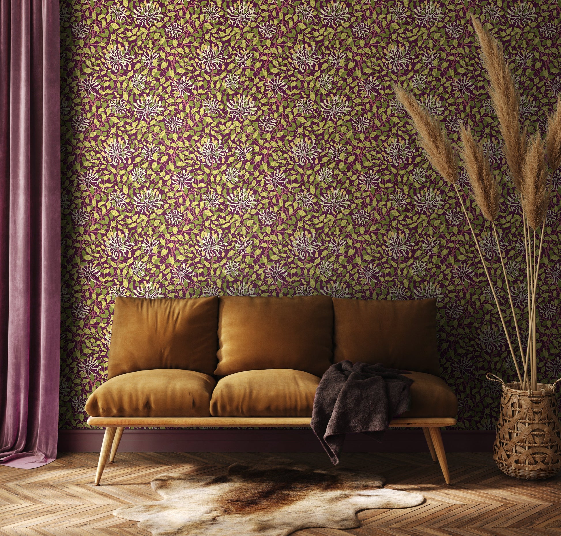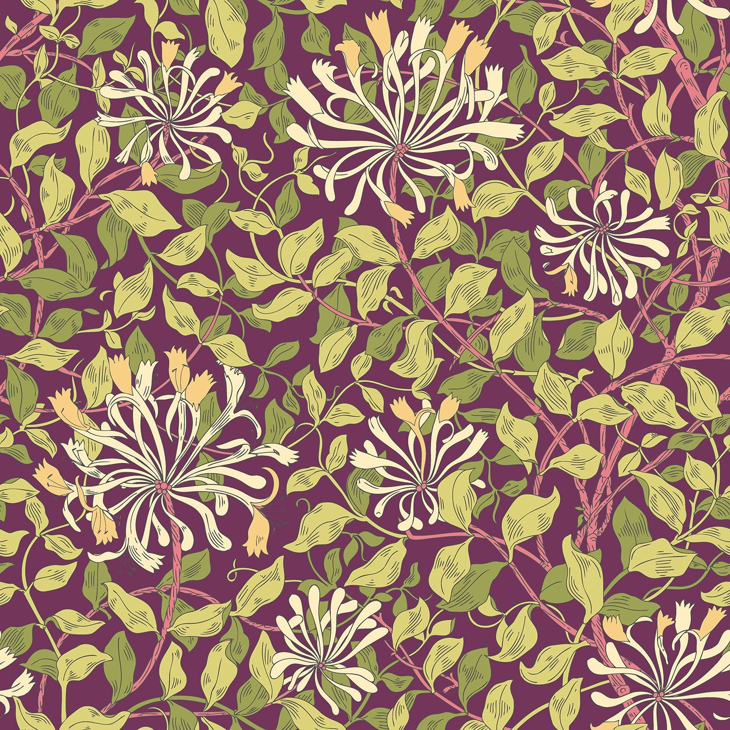 The wallpaper's image features an intricate pattern where realistic honeysuckle vines elegantly entwine with lush leaves, creating a dynamic flow across the surface. The rich aubergine hue brings warmth and character to any room, while delicate, hand-drawn details evoke a sense of natural beauty and movement. A subtle homage to the arts and crafts movement is evident in the illustrative style, inspired by the work of May Morris, lending a timeless and classic feel to your space.
