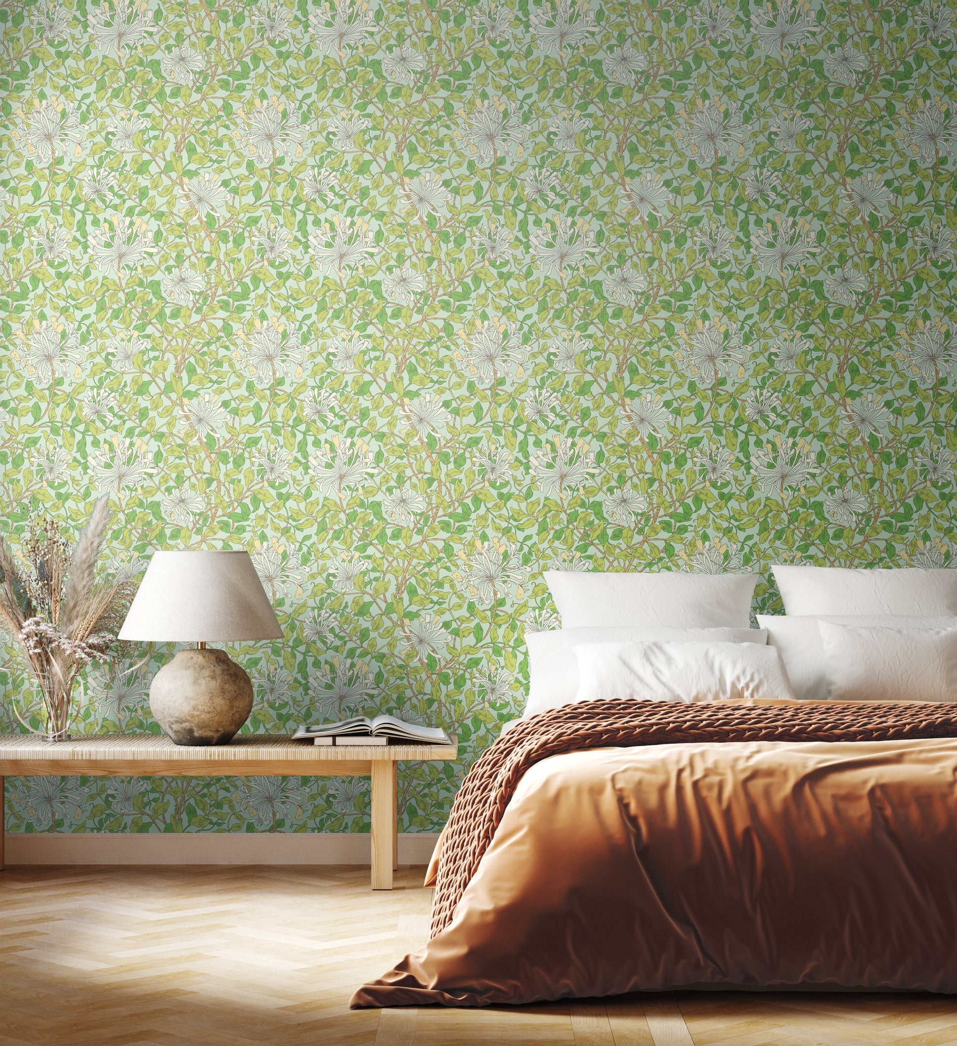 In the image, delicate honeysuckle vines wind lazily across a serene duckegg blue background. Detailed, verdant leaves are carefully realised, giving a lifelike impression that instantly draws the eye. The flowing organic trail adds gentle movement and a sense of tranquillity, perfect for creating a calm and welcoming atmosphere in your home.