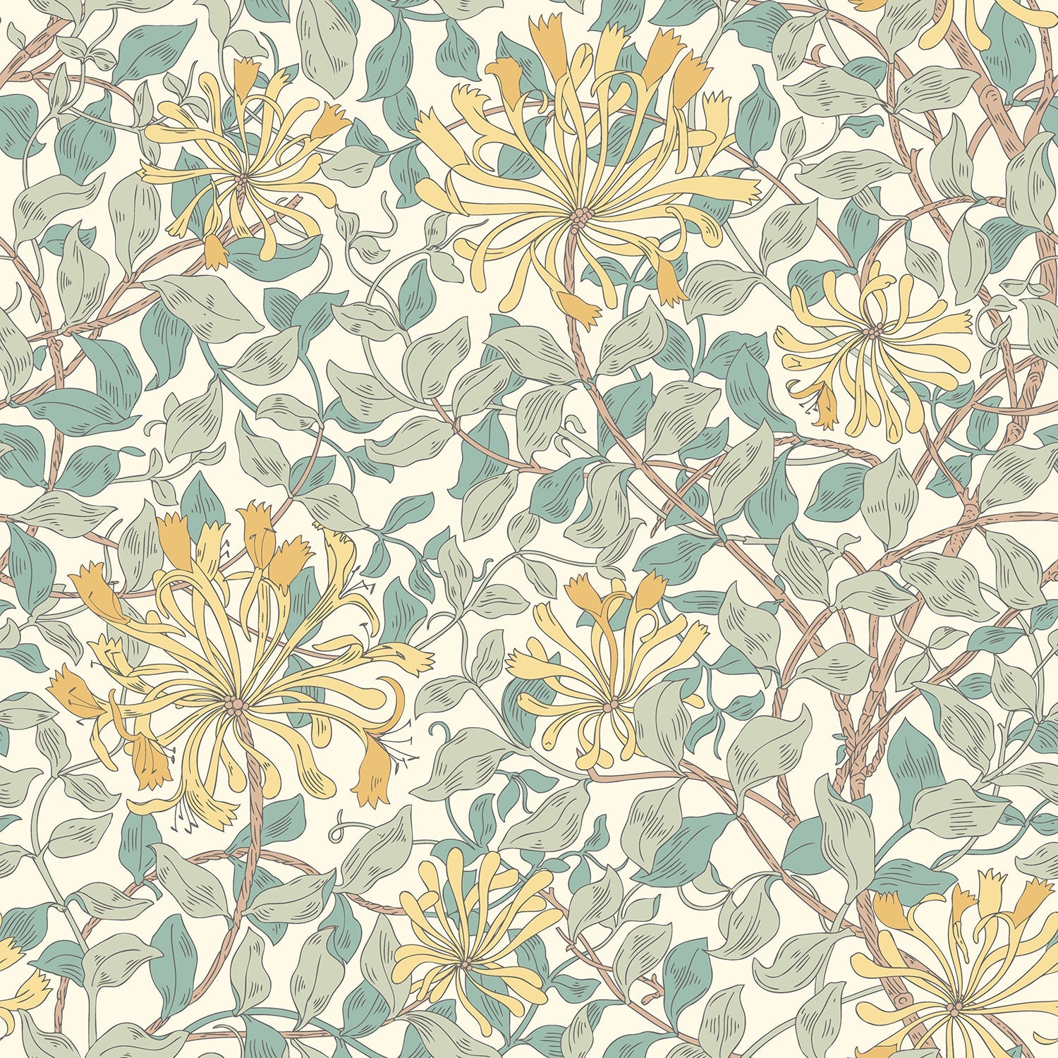 In this stunning wallpaper, trailing honeysuckle vines elegantly entwine with vivid leaves, creating a graceful movement across the surface. The seafoam backdrop lends a sense of calming sophistication, while the intricate vine pattern pays homage to the timeless style of the Arts and Crafts era. Each coil and tendril is artfully depicted, reminiscent of detailed hand-drawn illustrations.