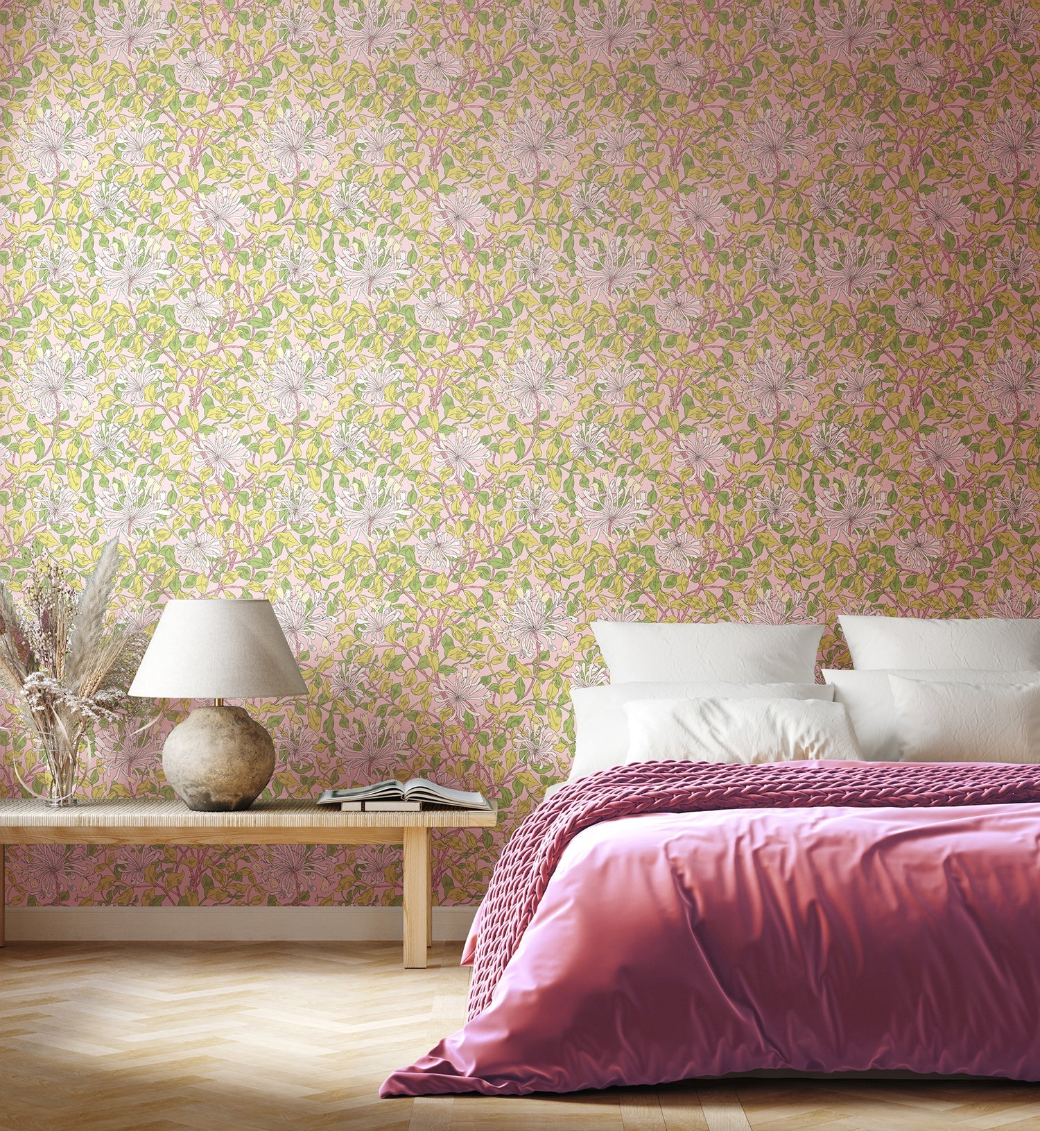 The image captures delicate honeysuckle vines gracefully weaving their way across a soft pink backdrop. Intricately entwined leaves create a gentle, meandering trail, conjuring a sense of peace and classic beauty reminiscent of botanical illustrations. The overall effect adds a serene yet sophisticated charm to any room.