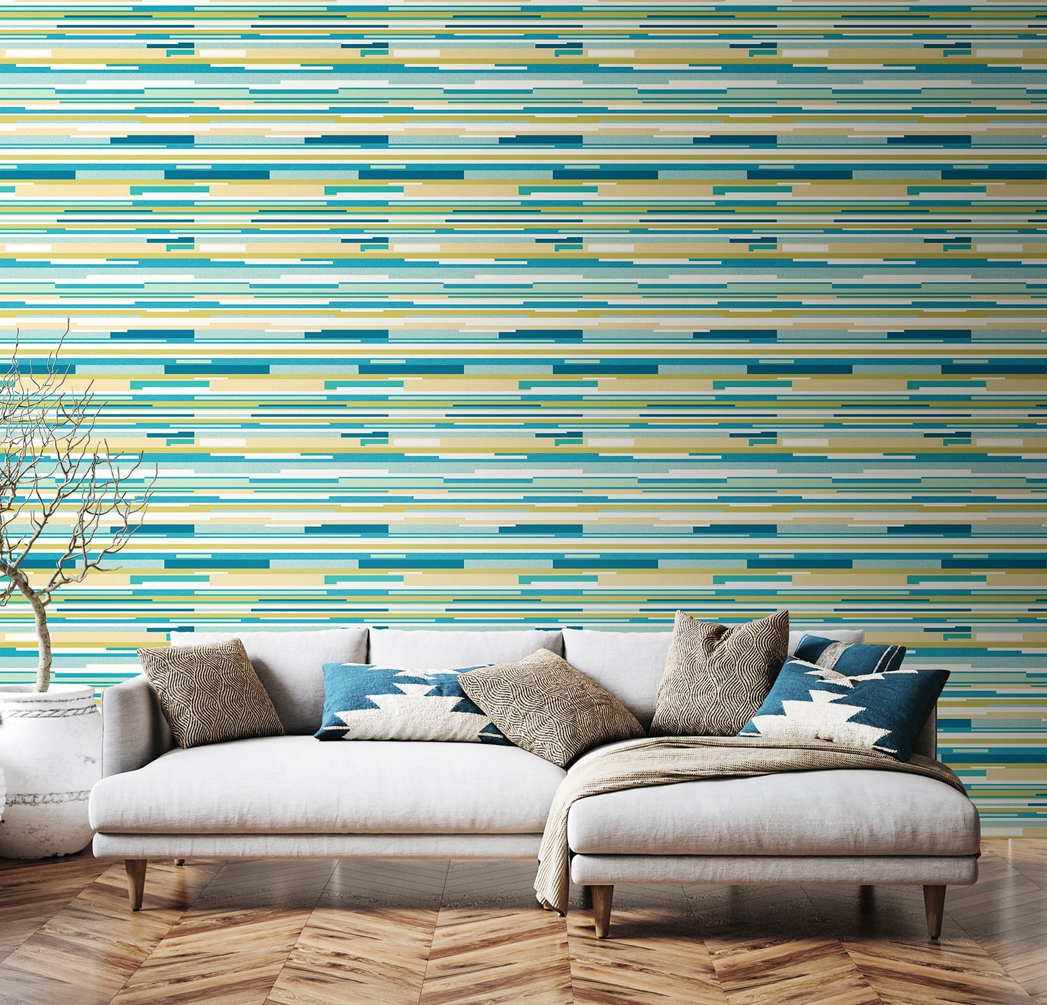 - Designer wallpaper with bold, architectural horizontal stripes in teal and blue