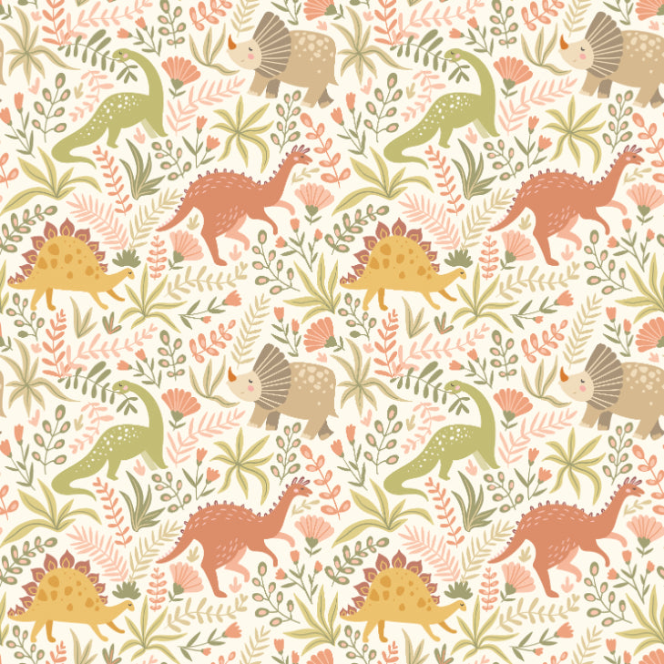- Features smiling dinosaurs, colourful foliage and engaging botanical accents