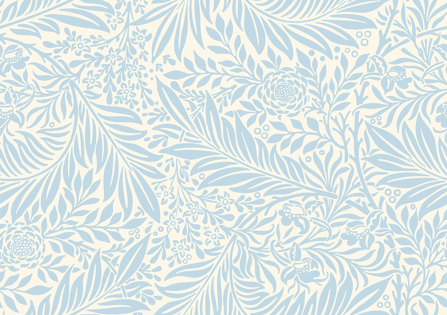 The image reveals a mesmerising tapestry of twisting leaf vines and delicate buds, meticulously rendered in soothing shades of Wedgewood blue. The botanical composition drapes gracefully across the backdrop, while a subtle scattering of dots creates visual depth and interest, allowing the motif to conjure a sense of tranquillity and heritage within the space.