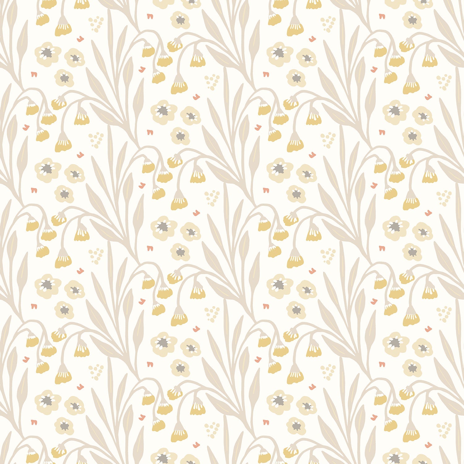 The image showcases a series of modern, clean-lined motifs reminiscent of linocut printing. Distinctive flower droplets and delicate leaves line up in elegant stripes, creating a beautiful rhythm that guides the eye smoothly across the wall. The ochre and stone tones blend harmoniously for a naturally soothing yet sophisticated touch, perfect for chic and contemporary homes.