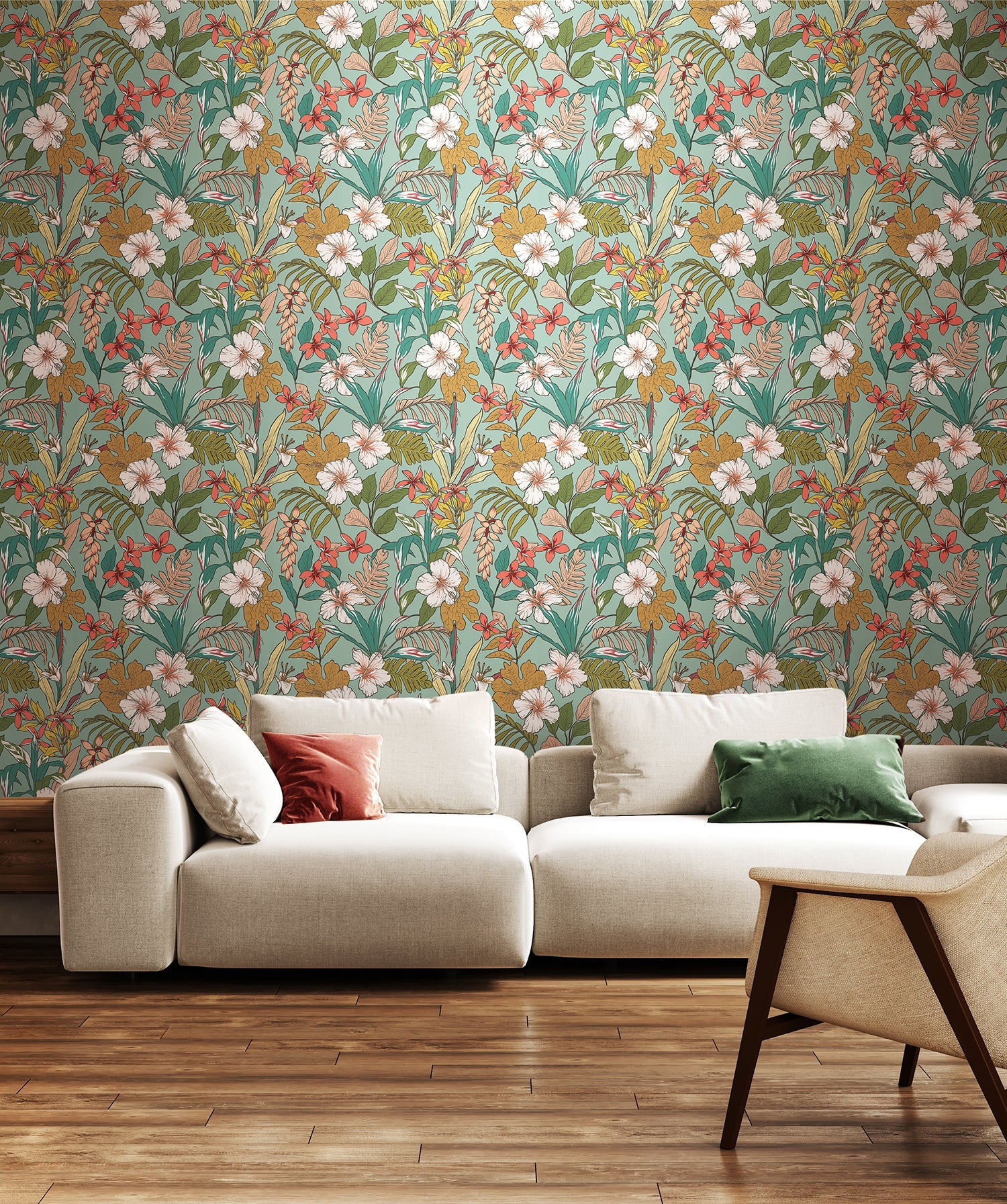The image features a vibrant scene reminiscent of an exotic retreat, bursting with lush green foliage and cheerful blooms in vivid hues of coral and teal. Lively botanicals weave across the surface, bringing a fresh, uplifting atmosphere to any interior. The colourful floral illustrations are contrasted against a subtle backdrop, drawing the eye and evoking the tranquility of a tropical haven.