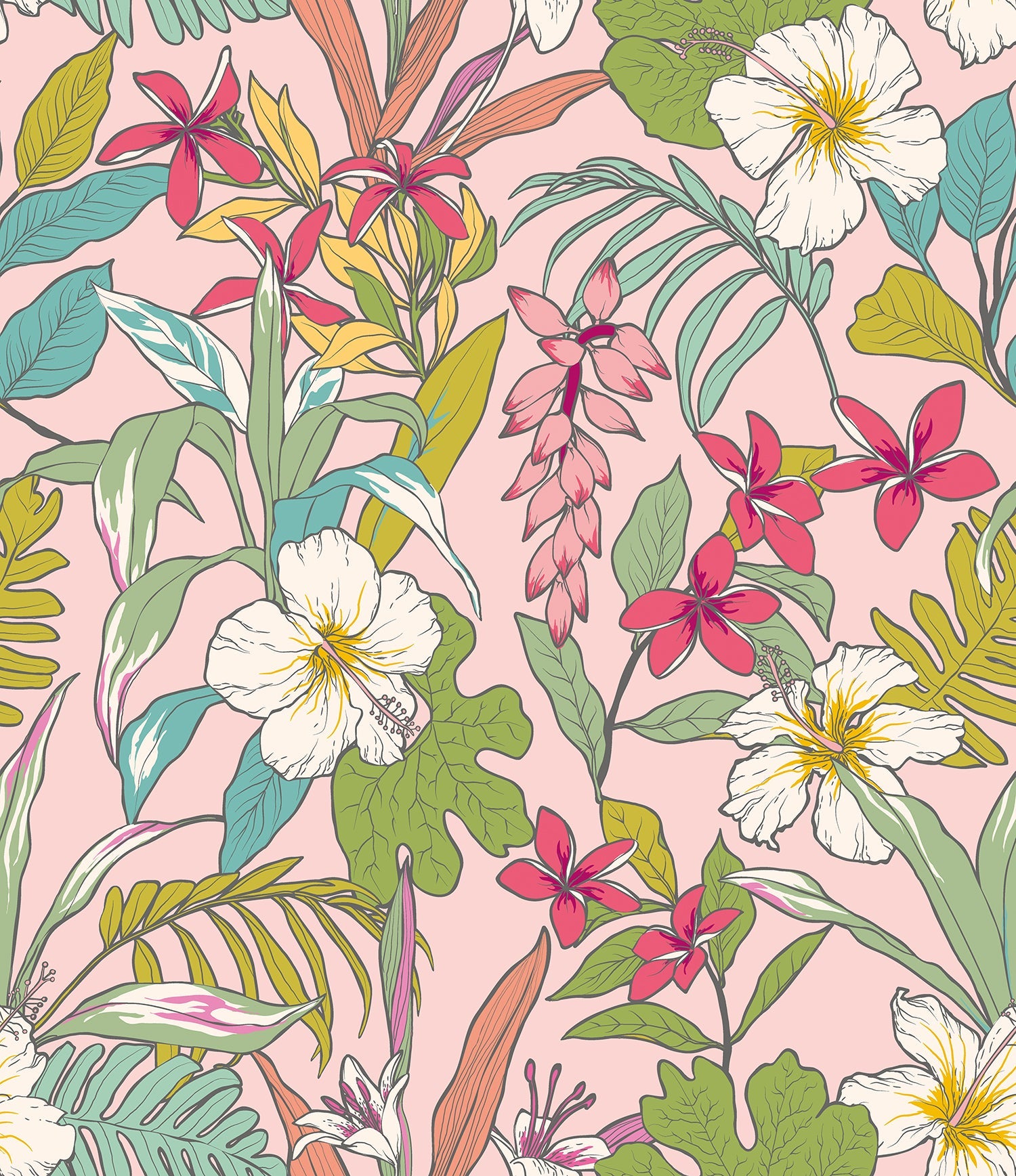 The Hoopla Walls Oasis Pink Mix wallpaper brings the essence of an exotic retreat directly into your home, as described by its captivating motif of leafy abundance and pretty floral details. This designer wallpaper invigorates your living environment, introducing a sense of paradise and whimsy. It is perfect for those seeking to make a bold statement with playful, colourful décor.