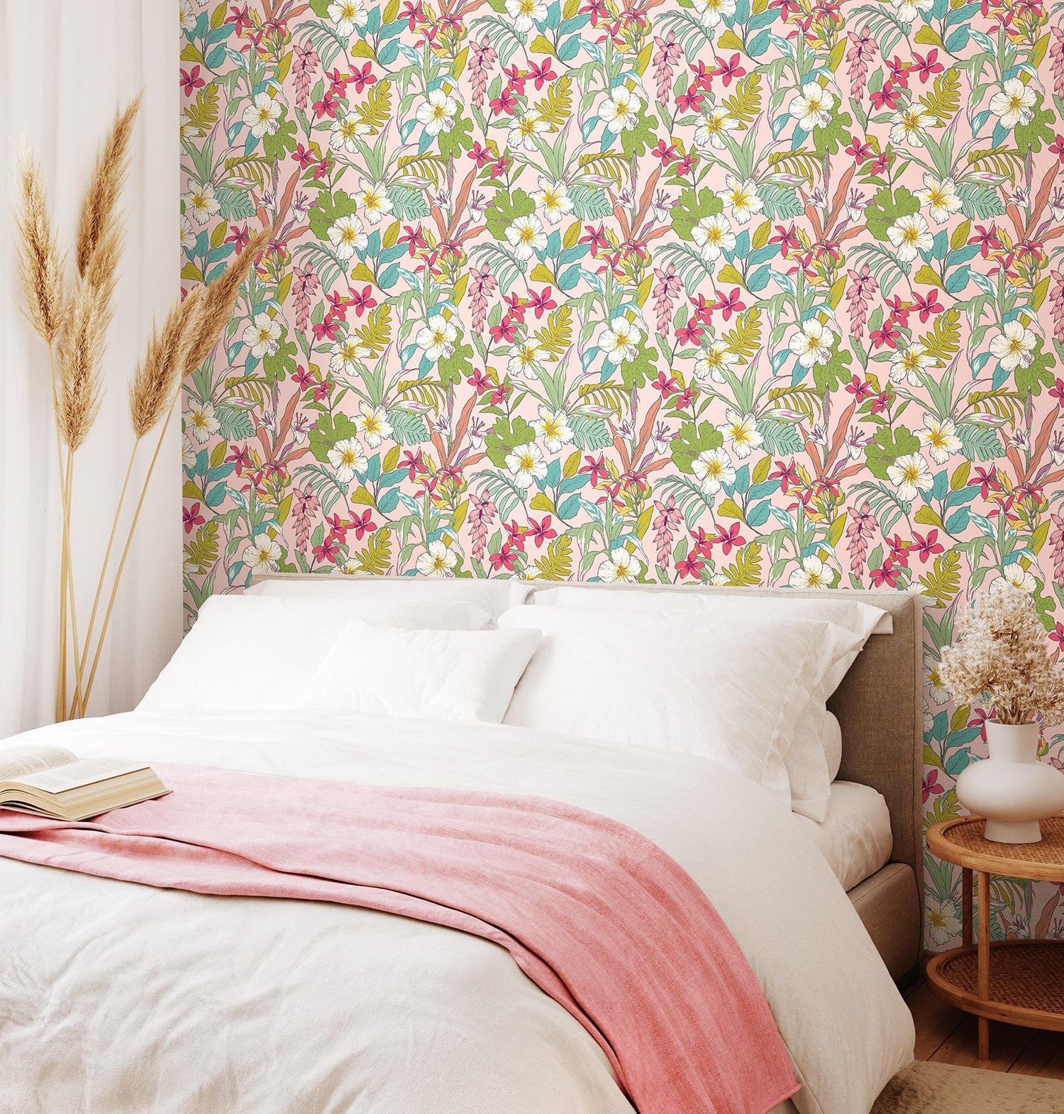 The visual of the Oasis Pink Mix features an intricate tapestry of vibrant green foliage interlaced with exuberant pink and multicoloured floral depictions. The composition evokes the lush serenity of a tropical paradise, where bold botanicals and blooms sweep across the wallpaper in harmonious patterns. These striking illustrations infuse any room with energy, vibrancy, and a refreshing new ambience.