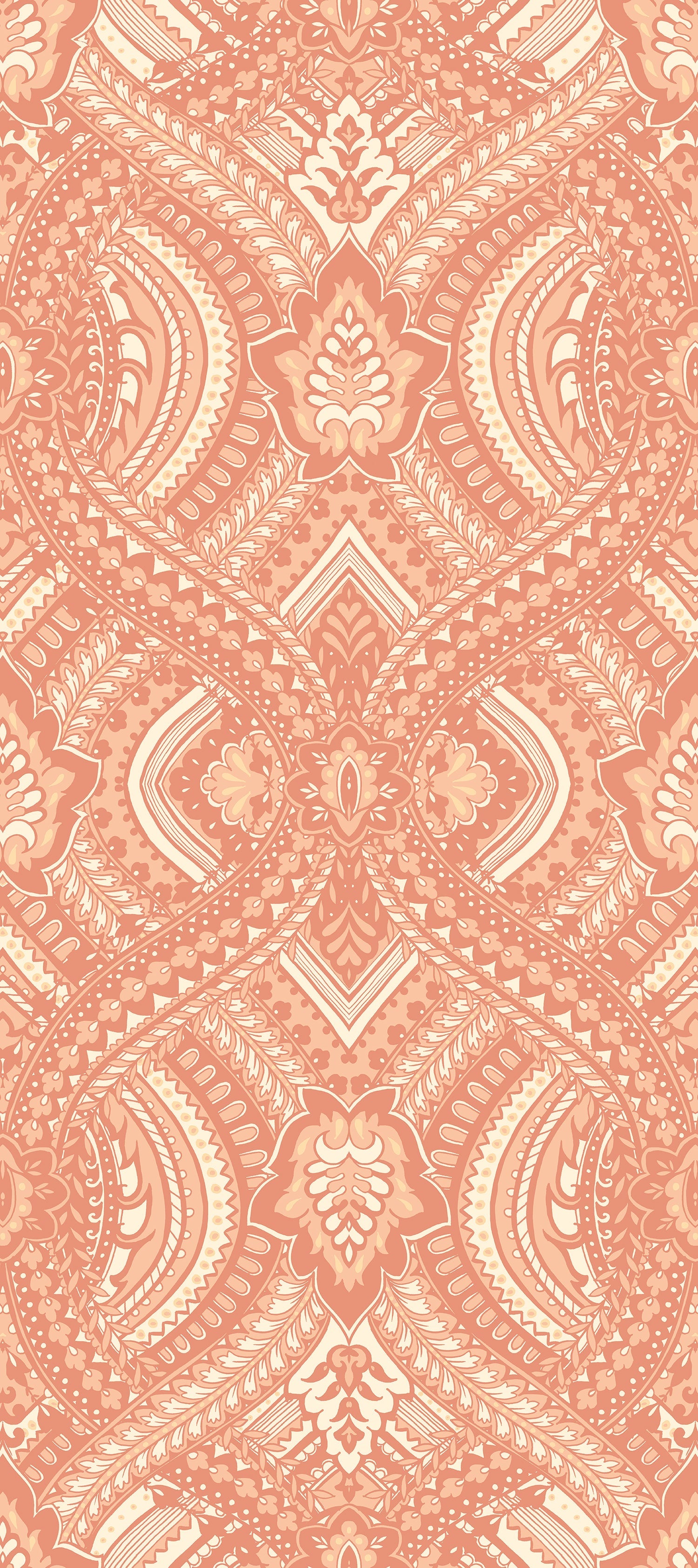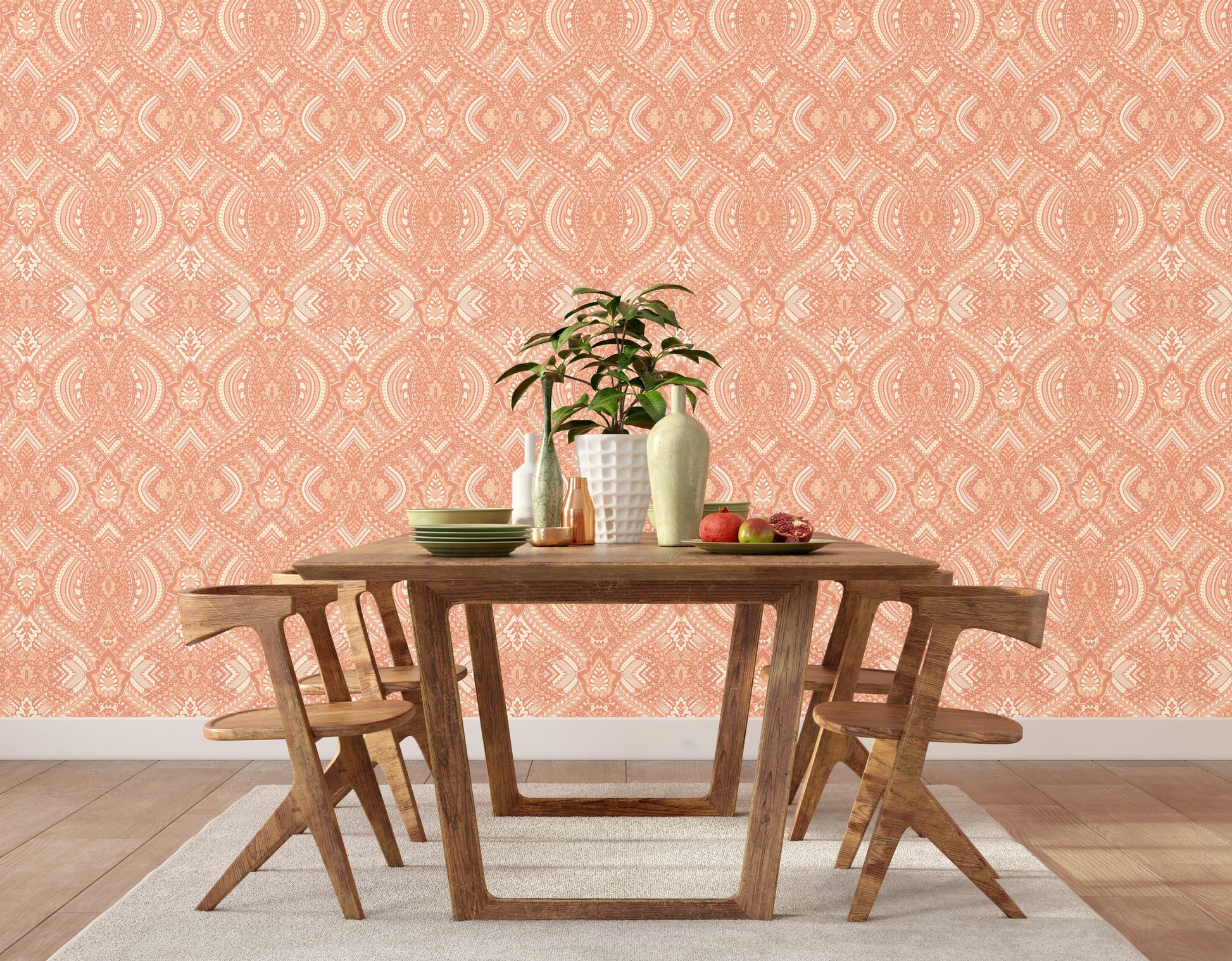 The image reveals a stunning expanse of mirrored ogee trails, each gracefully interlaced with intricate damask motifs. Subtle, harmonious shades of orange create visual depth and warmth, while the symmetrical pattern adds a sense of relaxed sophistication to any setting. The overall effect is both elegant and inviting, making this wallpaper a versatile choice for a range of décor styles.