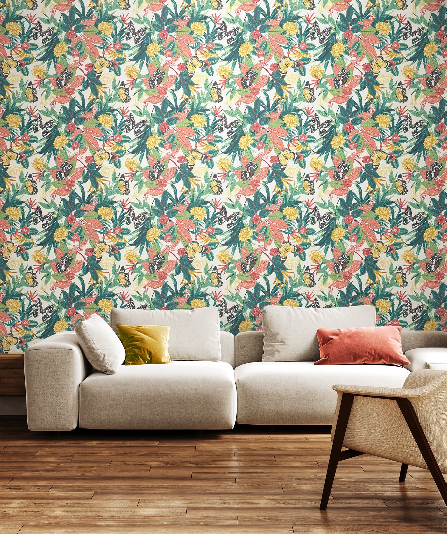- Features a botanical haven of butterflies, palm leaves and blooms