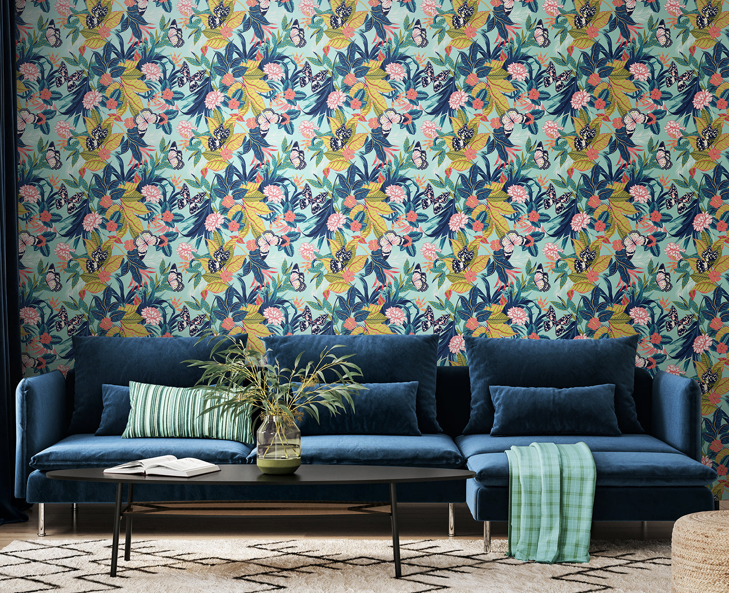 The design enchants at first glance, presenting a captivating tableau of vivid butterflies fluttering amidst lush palm leaves and exquisite blooming flowers. Soft aqua tones merge harmoniously with striking rouge accents, evoking the refreshing ambience of a tropical sanctuary. Each detail is rendered with intricate care, creating a rich tapestry that feels inviting and radiant.