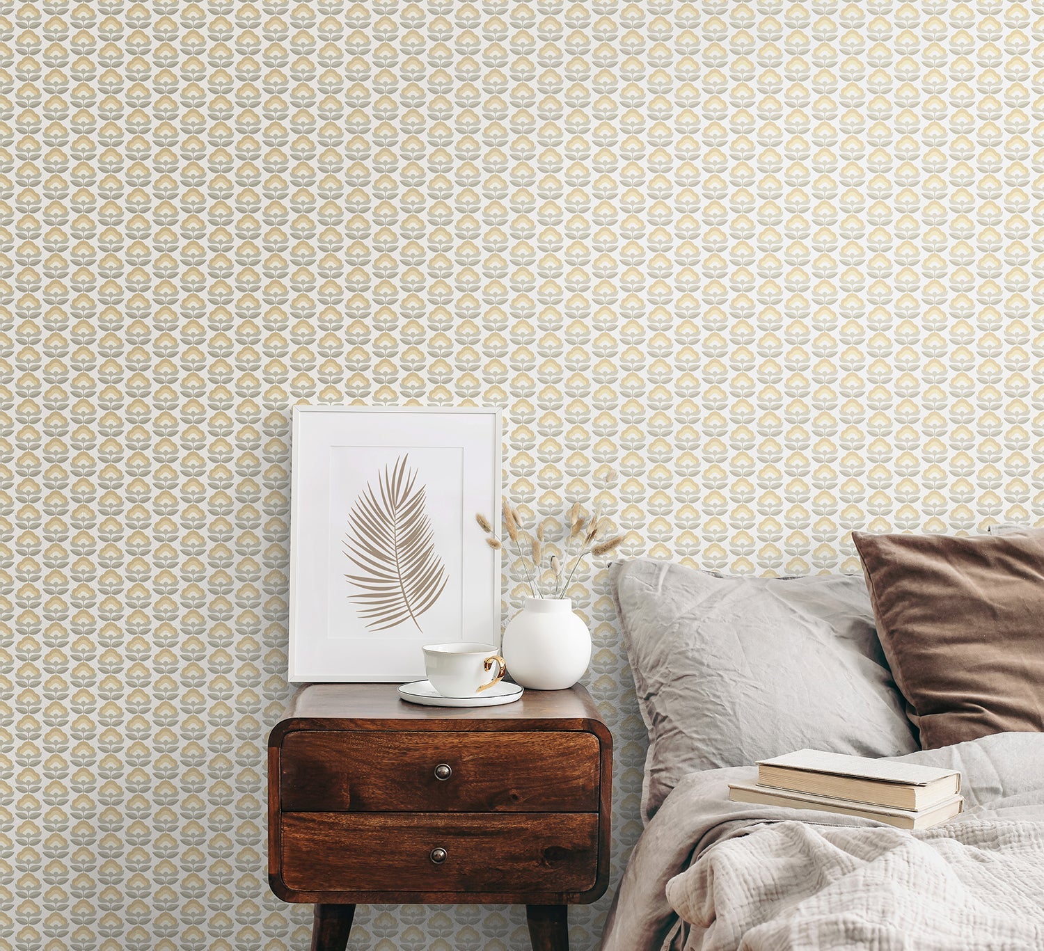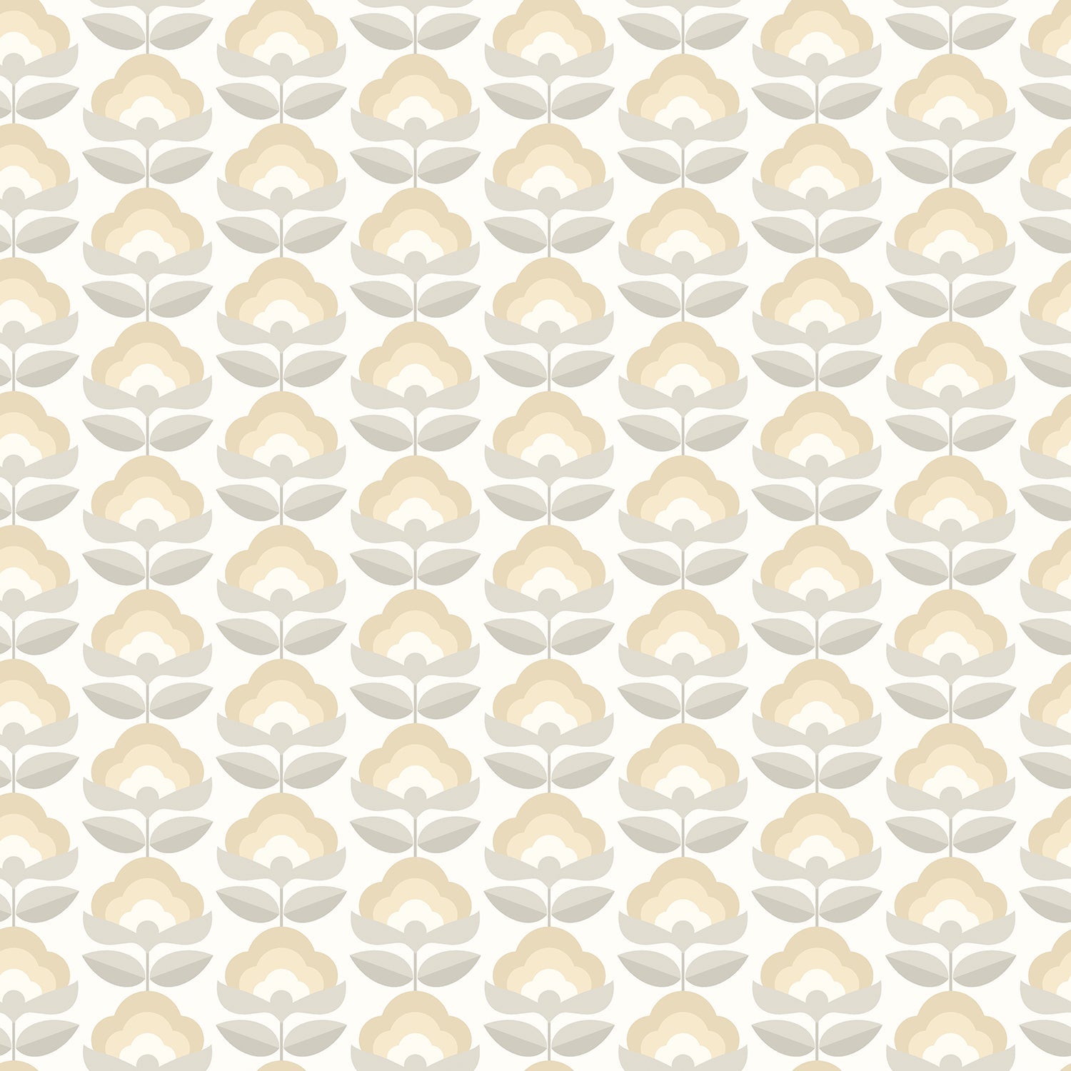 The image showcases a charming collection of delicately repeating floral motifs, arranged in a harmonious pattern across the surface. Playful blossoms in mellow stone and subtle dove hues evoke a sense of nostalgia while imbuing the space with a fresh, uplifting energy. The retro aesthetic feels both vibrant and refined, perfect for those who appreciate unique, eye-catching wall decor.