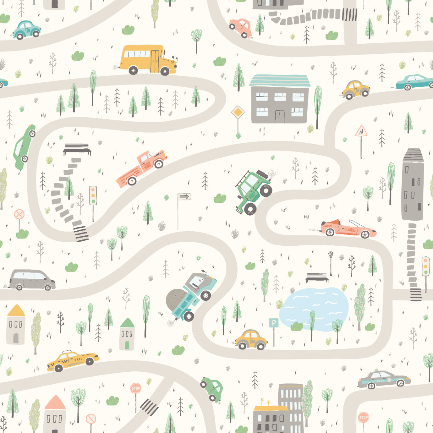 The image showcased bursts with whimsical charm: brightly coloured cars, lively buses, and cheerful jeeps travel along winding roads, all set against a warm and inviting backdrop. The playful scene whisks you into the heart of a bustling road trip, teeming with energy and excitement. Every vehicle appears to be mid-journey, inviting little ones to dream up new destinations and stories.