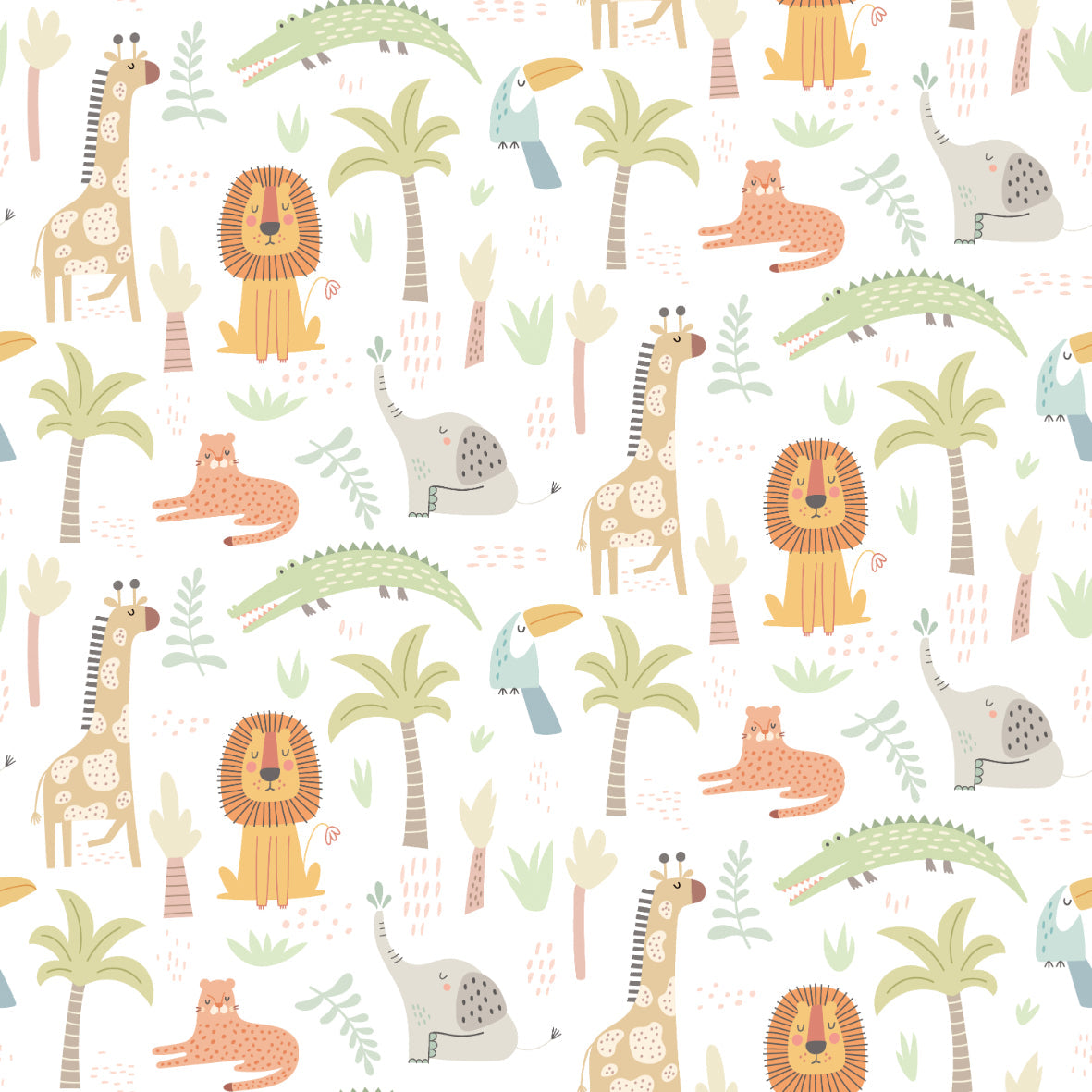 This delightful wallpaper brings a cheerful parade of animals to life. The image depicts friendly lions, giraffes, and elephants set against a honey-toned backdrop, each character illustrated in a way that sparks excitement and storytelling. Gentle greens and natural tones lend a soothing atmosphere, while playful animals appear to peek out from the walls, creating a peekaboo effect that ignites young imaginations and transforms a simple space into a vibrant adventure across the savannah.