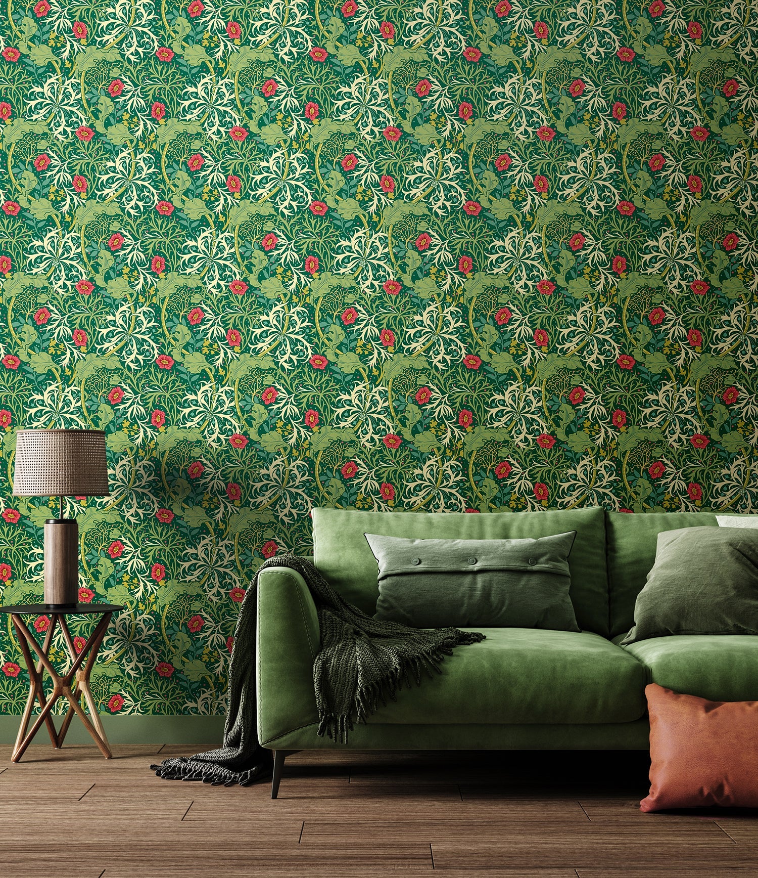 This exquisite wallpaper is from Hoopla Walls, a renowned brand celebrated for its high-quality designs and esteemed reputation in interior décor. Drawing inspiration from the legendary John Dearle for William Morris, every detail epitomises fine artistry and craftsmanship.