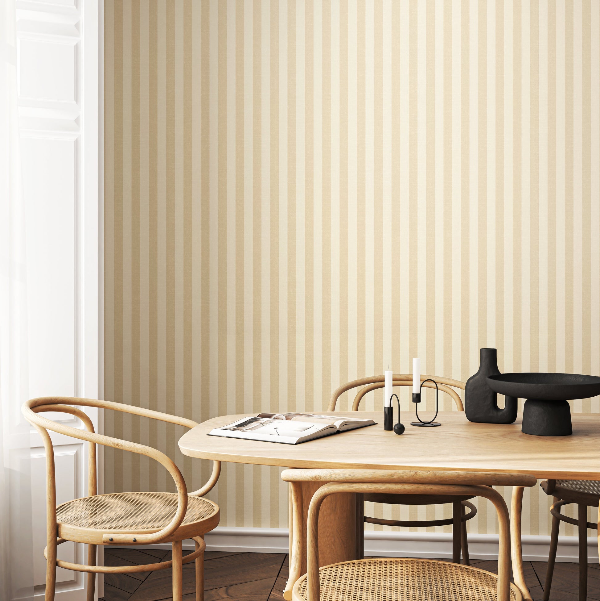 The image reveals a serene and stylish wall adorned with gentle, understated stripes that seem to glide effortlessly across its surface. The subtle interplay of shadow and light enhances the ambiance, lending a tranquil and modern touch to the room, while offering a beautifully textured appearance that feels both inviting and elegant. Muted sand hues give the space a warm yet airy effect, effortlessly complementing a variety of interior styles.