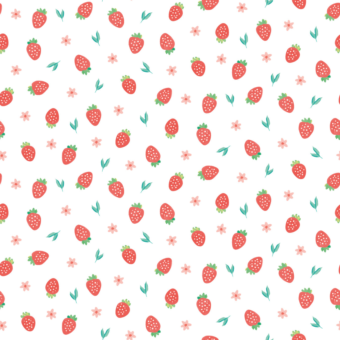 The image displays a charming wallpaper adorned with watercolour strawberries scattered playfully across a fresh white background. Cheerful little daisy flowers peek between the strawberries, creating an uplifting and whimsical look. The soft, hand-painted textures lend the scene a gentle and inviting atmosphere, ideal for enhancing both traditional and contemporary interiors.