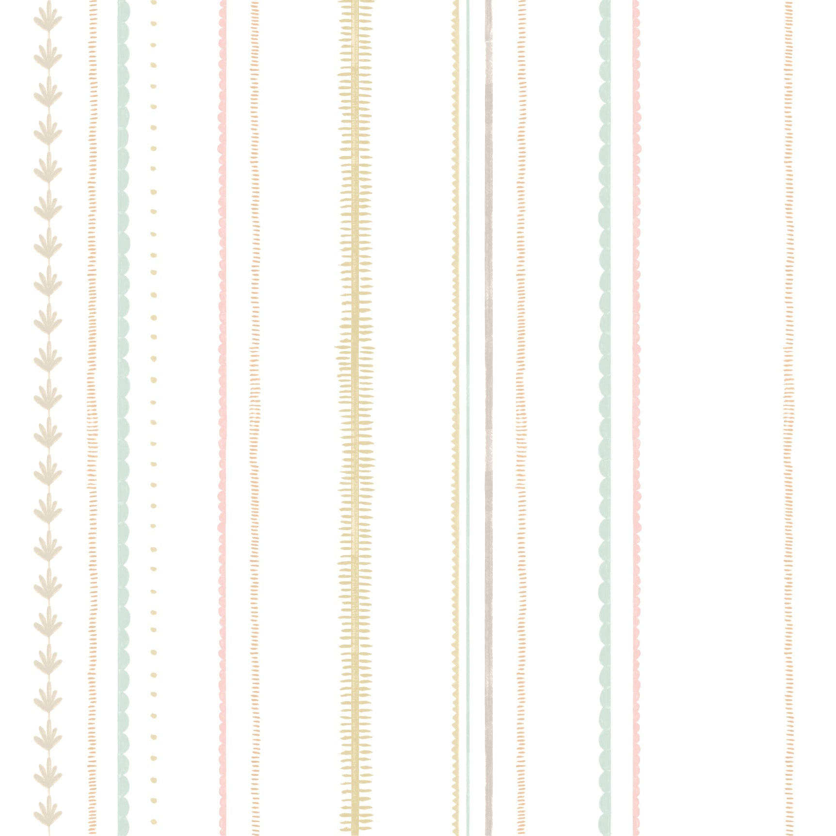 The wallpaper showcases a delightful interplay of crisp, painterly stripes interwoven with organic dashes, playful dots and whimsical squiggles. The image captures the contemporary spirit of the design – brushstrokes flow gracefully across the surface, infusing the room with subtle charm and a unique character. Gentle layers of colour and pattern evoke a sense of playful energy while blending seamlessly with both modern and timeless interiors.